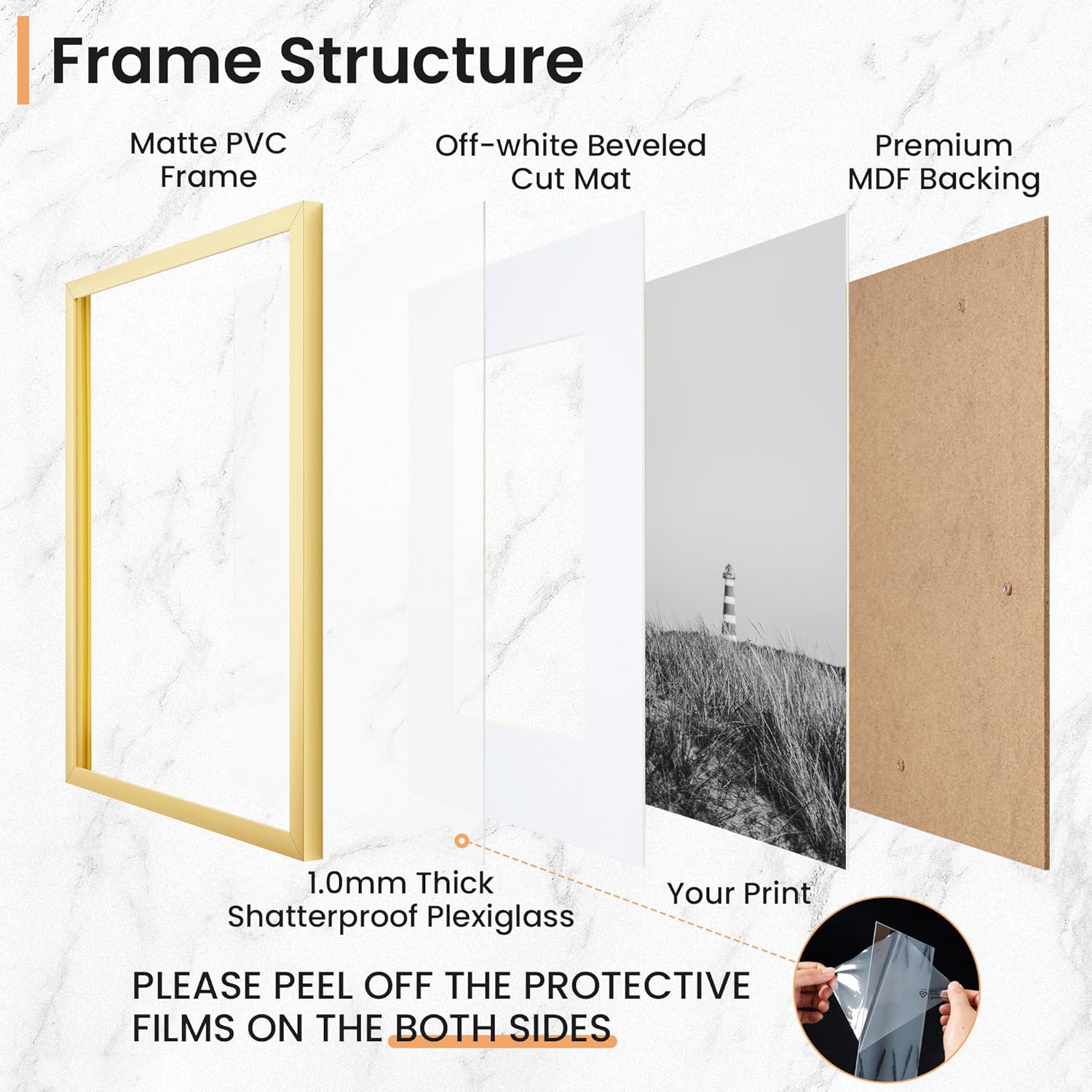 • Intact Parts & Safe Packing - We pack our plastic picture frames carefully to ensure maximum protection during transit. Each frame is securely shrink-wrapped and reinforced with corner protectors. To prevent any possible damage, we use special customized corrugated boxes to package all our frames.