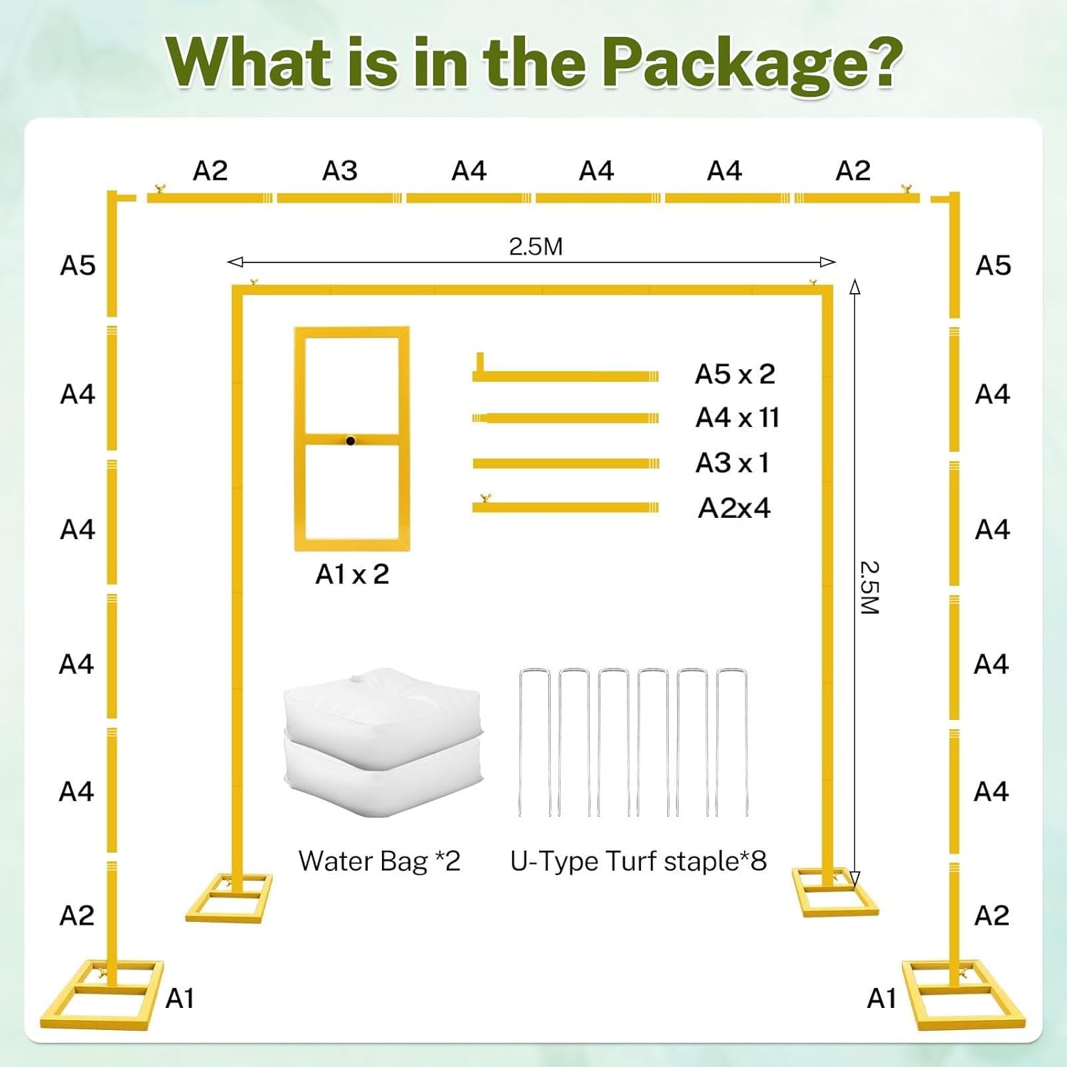 • [Heavey Duty Backdrop Stand] Our 8FT heavy-duty square backdrop stand features a gold rust-resistant finish and a sturdy, premium iron base for superior stability. Unlike other arch backdrop stand that use screws, which can loosen over time, our pipe joints connect via a rotating mechanism for a more secure and long-lasting hold. It also comes with a waterproof storage bag, making it easy to store and transport.