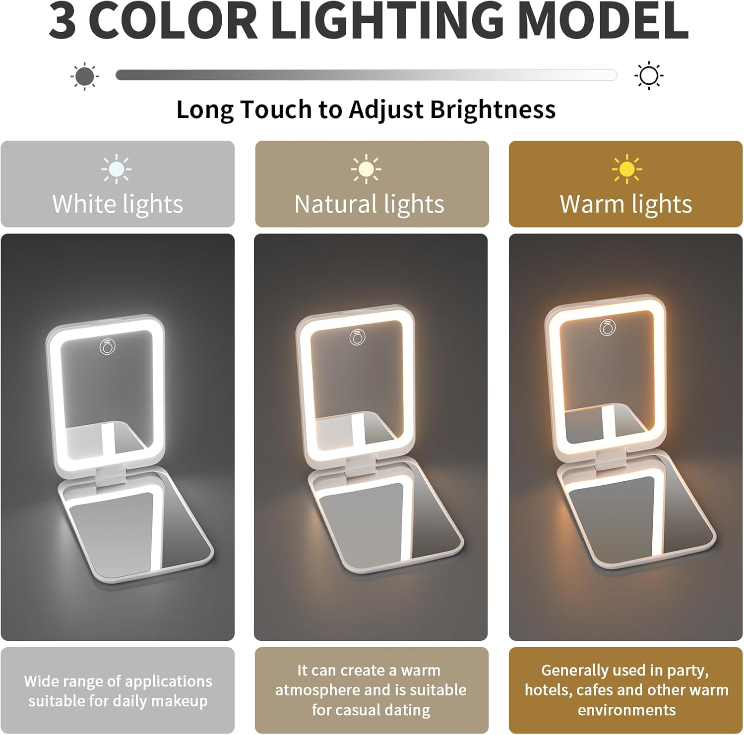 Kintion 2025 Pocket Mirror, Rechargeable Dimmable 3 Color Lighting 1X/3X LED Compact Travel Makeup Mirror for Purse, Portable, Folding, Handheld, Small Lighted Mirror for Women Gift, White