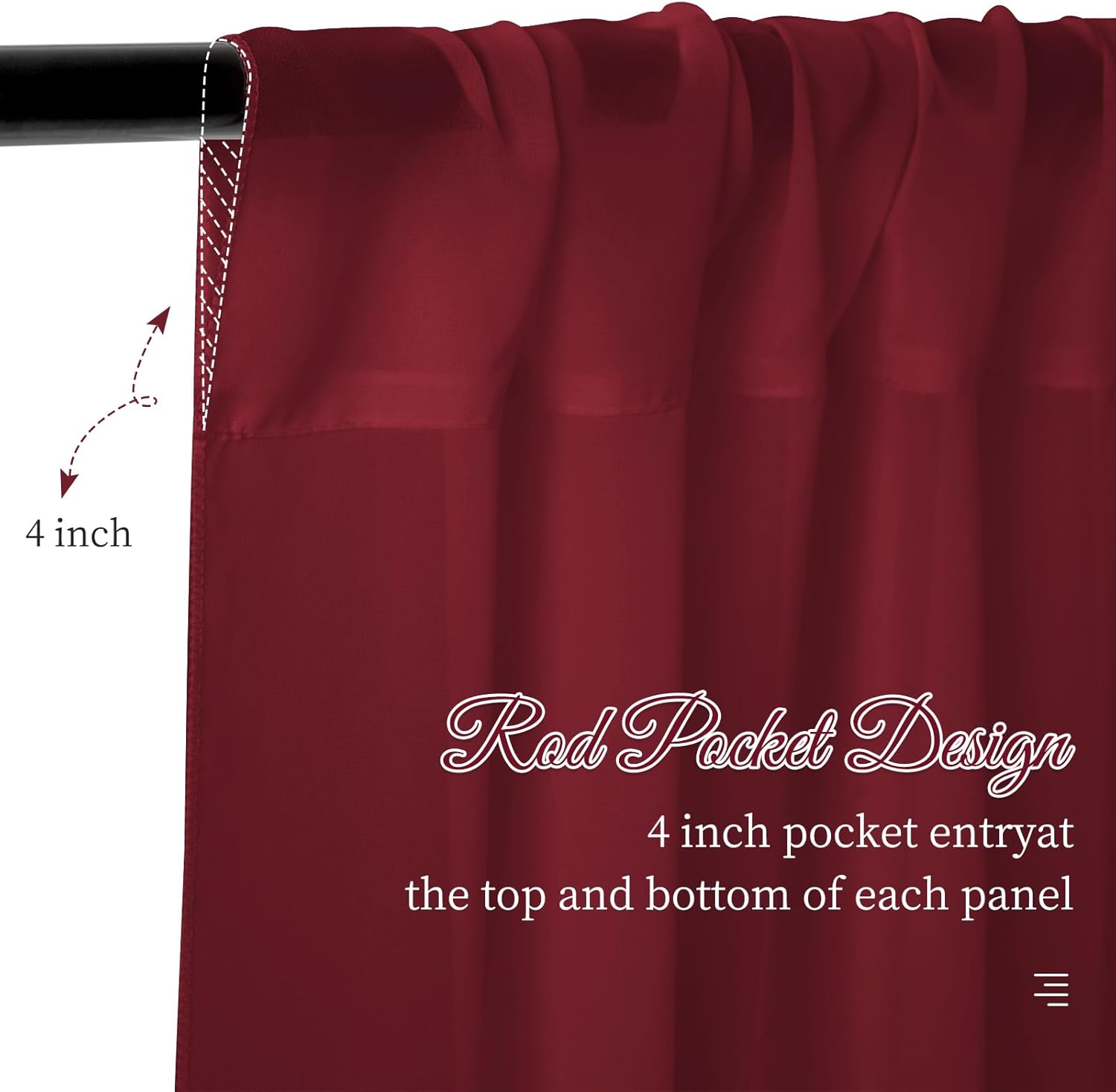 • Romantic Sheer Arch Drapes: The wedding ceiling curtains are finished with firm and exquisite stitching in all margins, which are airy and lightweight; here is a 4 inches pocket for rod or pole entry at the top and bottom of each panel creating beautiful draping. This sheer ceiling is also called as wedding decorations for ceiling, chiffon draping, tent draping fabric for wedding, event draping fabric, wedding wall covering, burgundy stage curtains, etc.