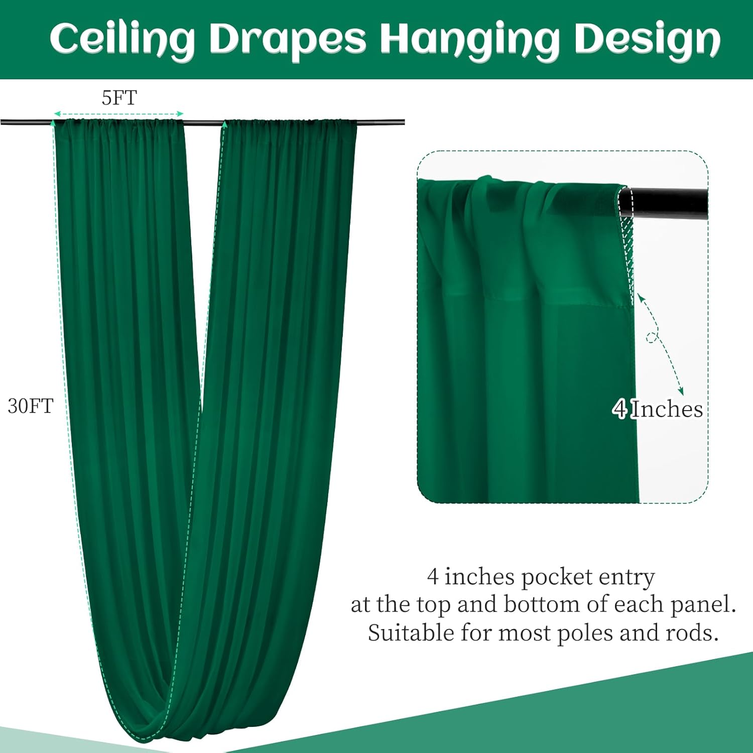 • Chiffon Ceiling Drapes: The package include 6 panels emerald green wedding ceiling drapes (without hanging pieces). Each wedding extra long curtain measure for 5 feet width x 30 feet length. The sufficient quantity can meet your demands for decorating your weddings, parties, receptions. It will help to create a delicate and aesthetic sense to your wedding ceiling decoration.