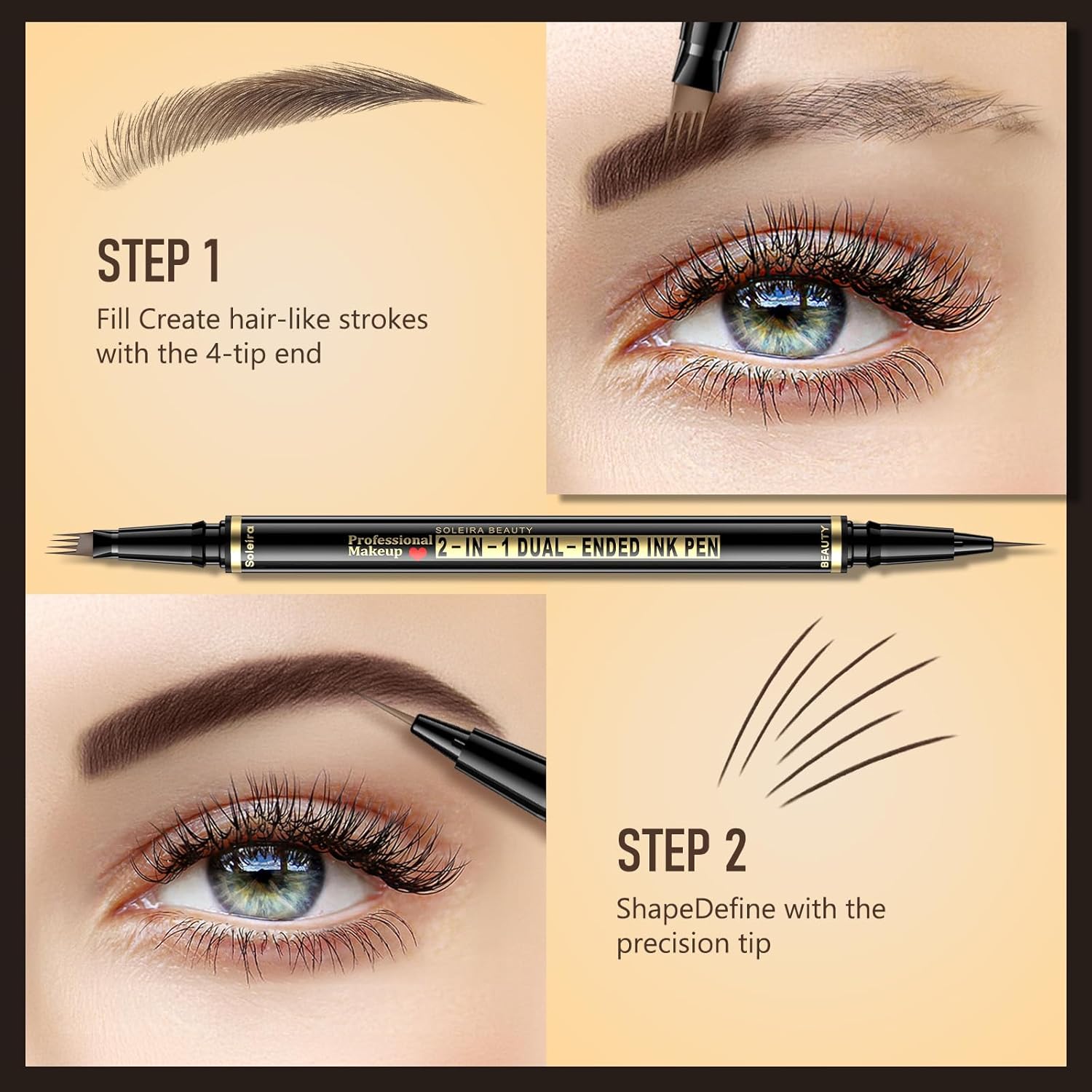 Eyebrow Pen, Soleira Waterproof Eyebrow Pencil with 4 Tip Microblading Eyebrow Pen and Dual-ended Eyebrow Brush, for Natural-Looking Brows, Long-Lasting, V2 Dark Brown