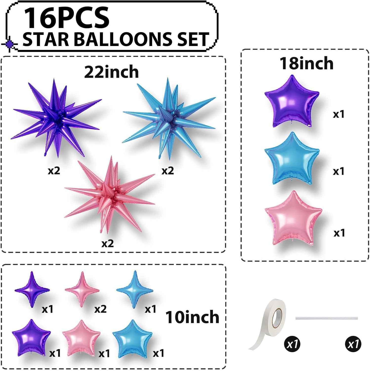 16 Pcs Pink Purple Blue Star Balloons, 22/18/10 Inch Foil Balloons, Four-Pointed Balloon for Girl Princess Mermaid Birthday Baby Shower Party Decorations
