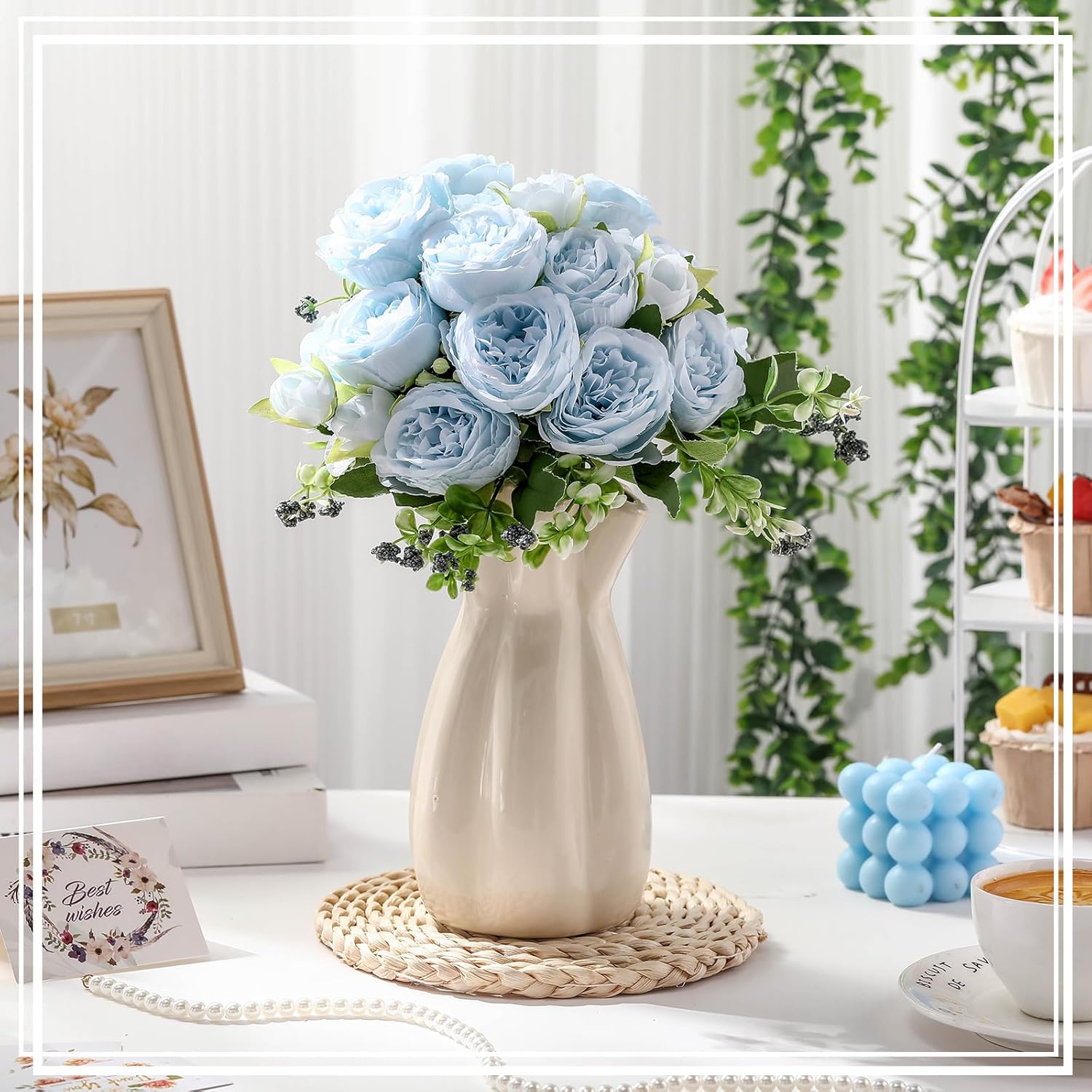 8 Bundles Artificial Peonies Flowers Boho Faux Flowers Arrangements Artificial Centerpiece Spring Bouquet Floral Wedding Decoration for Vase(Blue)