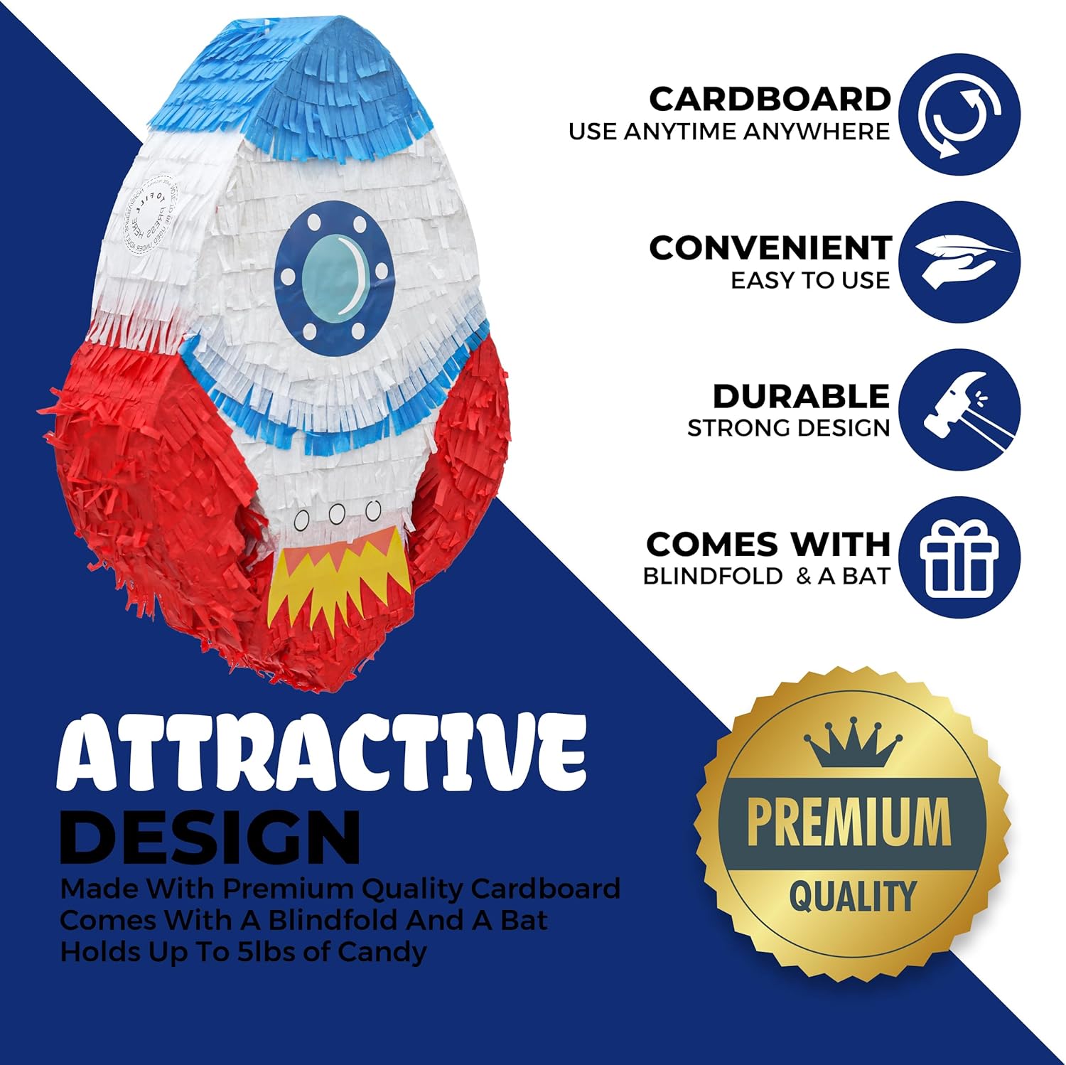 • ❤️【 PREMIUM QUALITY 】- The rocket pinatas measures 16.5x11.4x4 inches. Made with high and resistant cardboard. Decorated with crepe paper on bond paper, high strength plastic loop to hang. Premium material ensures its durability and fancy looking. It comes with a blindfold and bat to make more fun.