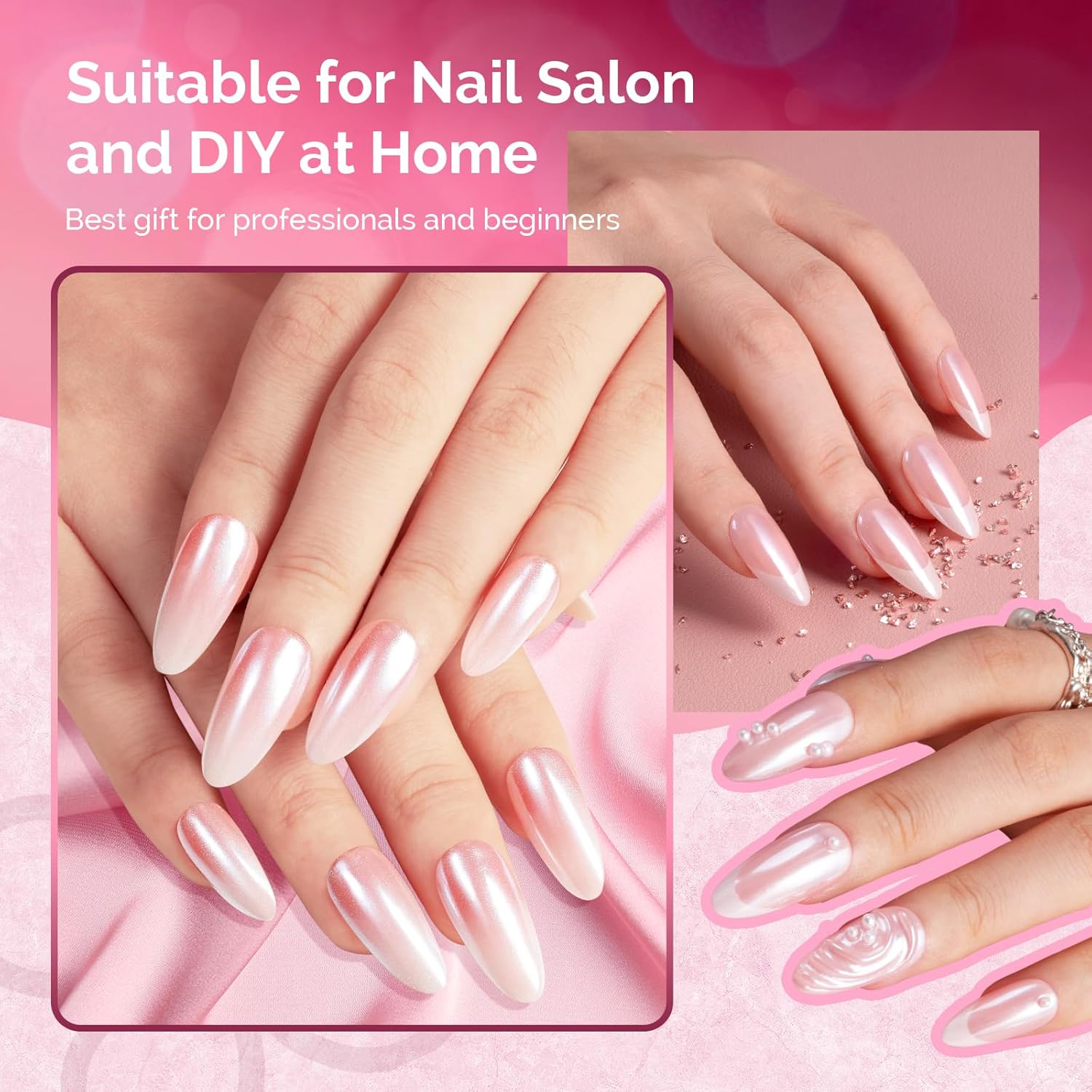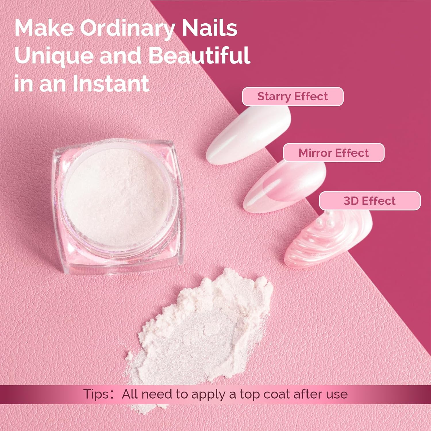 • White Pearl Chrome Nail Powder: Chrome nail powder has a very nice shiny mirror effect and can be used with different colors of gel nail polish to create different effects,just a little powder and your nail will be different