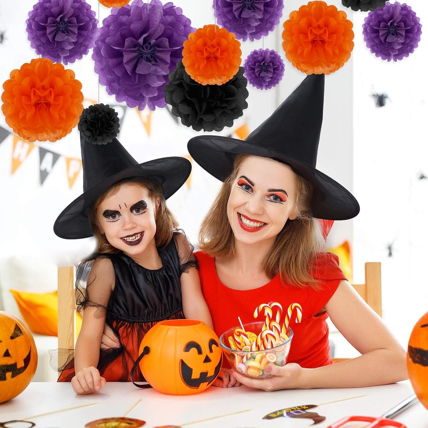 Tissue Paper Pom Poms, Black Orange Purple Tissue Paper Flowers, Hanging Flower Balls for Weddings Fiesta Parties Birthday Baby Showers Classroom Bridal Shower Decoration (18Piece Set-6/10/12/14Inch)