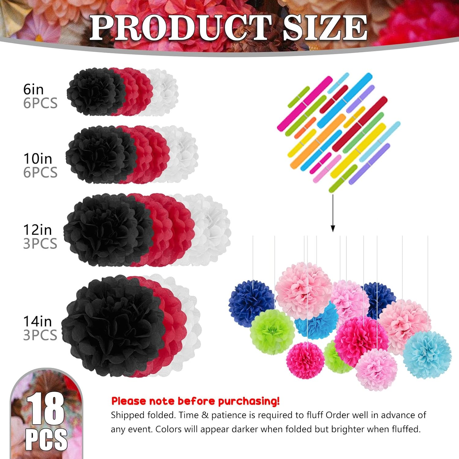 • 【Large Set】18 Pieces paper flower balls include 6 of 6-inch, 6 of 10-inch, 3 of 12-inch, and 3 of extra-large 14 inch paper pom pom flowers.This tissue flower set comes in 3 different colors including red,black,white, which will add charm to your celebration through different color combinations.