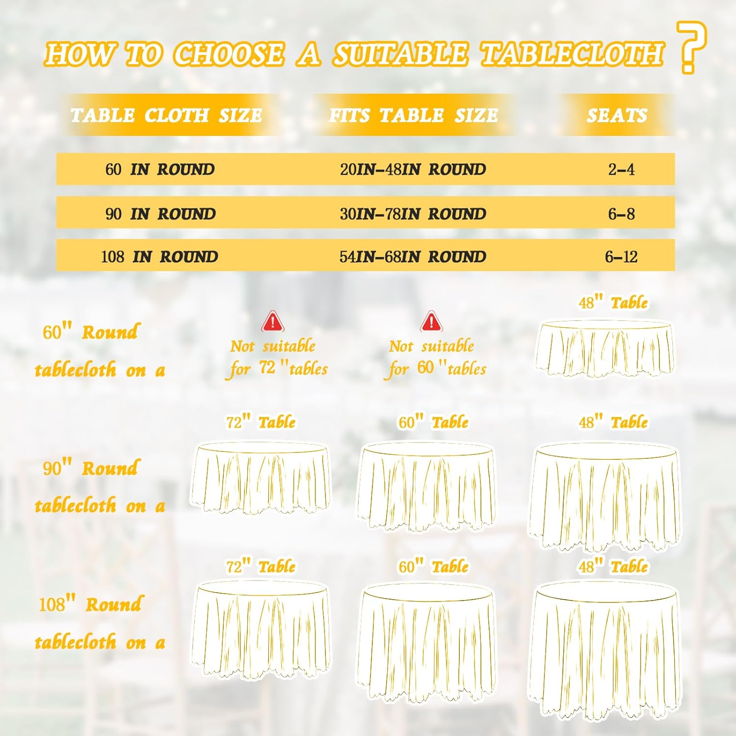 • Widely used scenarios: Round table cloth is suitable for wedding parties, dances, banquet events, birthday parties, restaurant tables, graduation parties, and daily dining tables. It can also be used as decorations for Halloween, Christmas, and Valentine's Day.