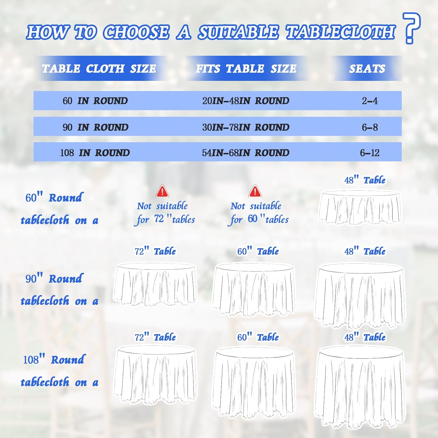 • Widely used scenarios: Round table cloth is suitable for wedding parties, dances, banquet events, birthday parties, restaurant tables, graduation parties, and daily dining tables. It can also be used as decorations for Halloween, Christmas, and Valentine's Day.