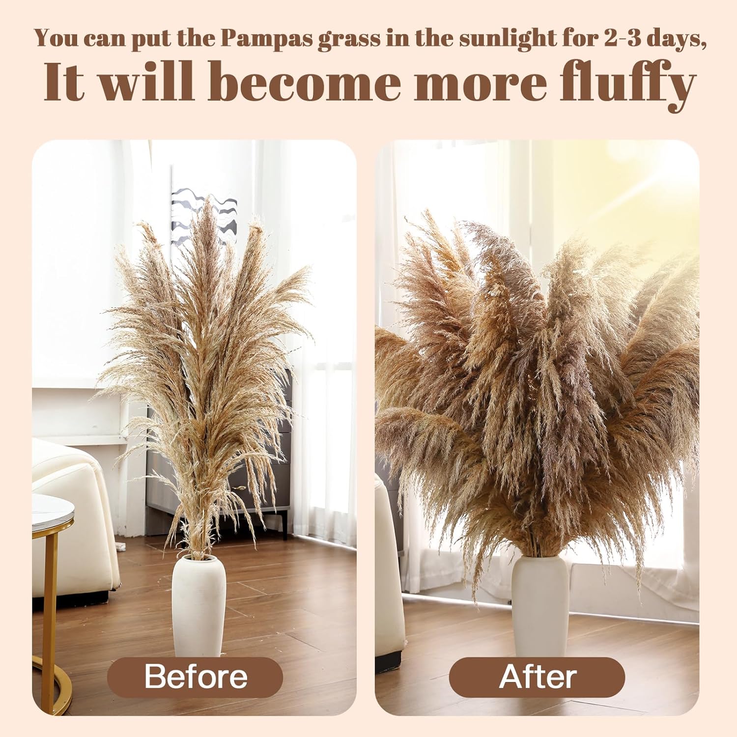 • PAMPAS GRASS DECOR:The color of the tall pampas grass is brown,dried pampas grass is naturally fluffy, beautiful and elegant,you can trim it to the appropriate size and place it in a vase in the sunlight. The brown pampas grass allows them to breathe in the sunshine and breeze, and this true beige color makes boho dried flowers look more fluffy and elegant.Large pampas grass lovely and beautiful.Tall pampas have a boho style and are suitable for boho flowers, event decors,boho wall decor