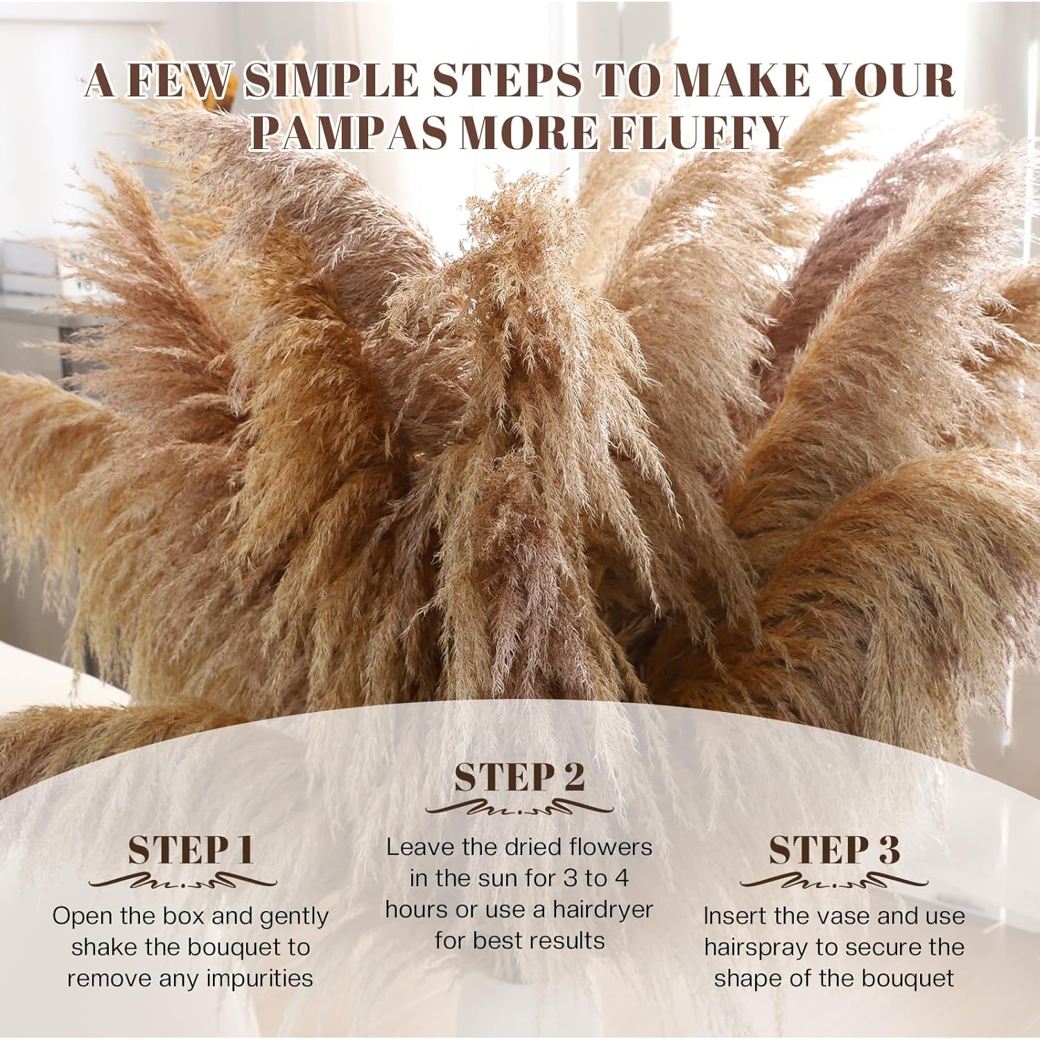• EASY MAINTENANCE:Pompas grass care is minimal. Shake the stem outdoors to reduce initial shedding. Leave pampass grass in the sunlight for 4 hours to achieve maximum fluffiness, and spray hair gel every six months.dried Pampas grass does not require water. (Do not shake the pompas floral forcefully)