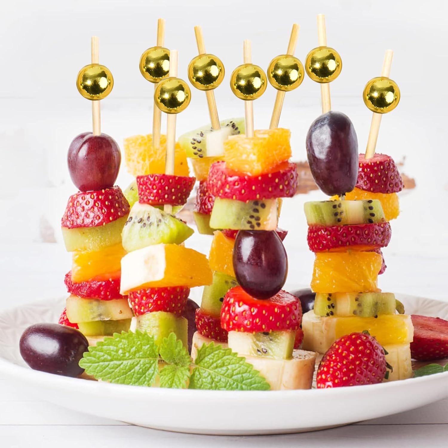 • Sturdy And Long: Appetizer skewers are made of high-quality natural bamboo, the surface is smooth and burr-free, and the gold ball at the end makes it easier to hold and gives you a comfortable feeling of use. Compared to plain toothpicks, ours are sturdy and long enough to not break easily and you can insert various foods more easily.