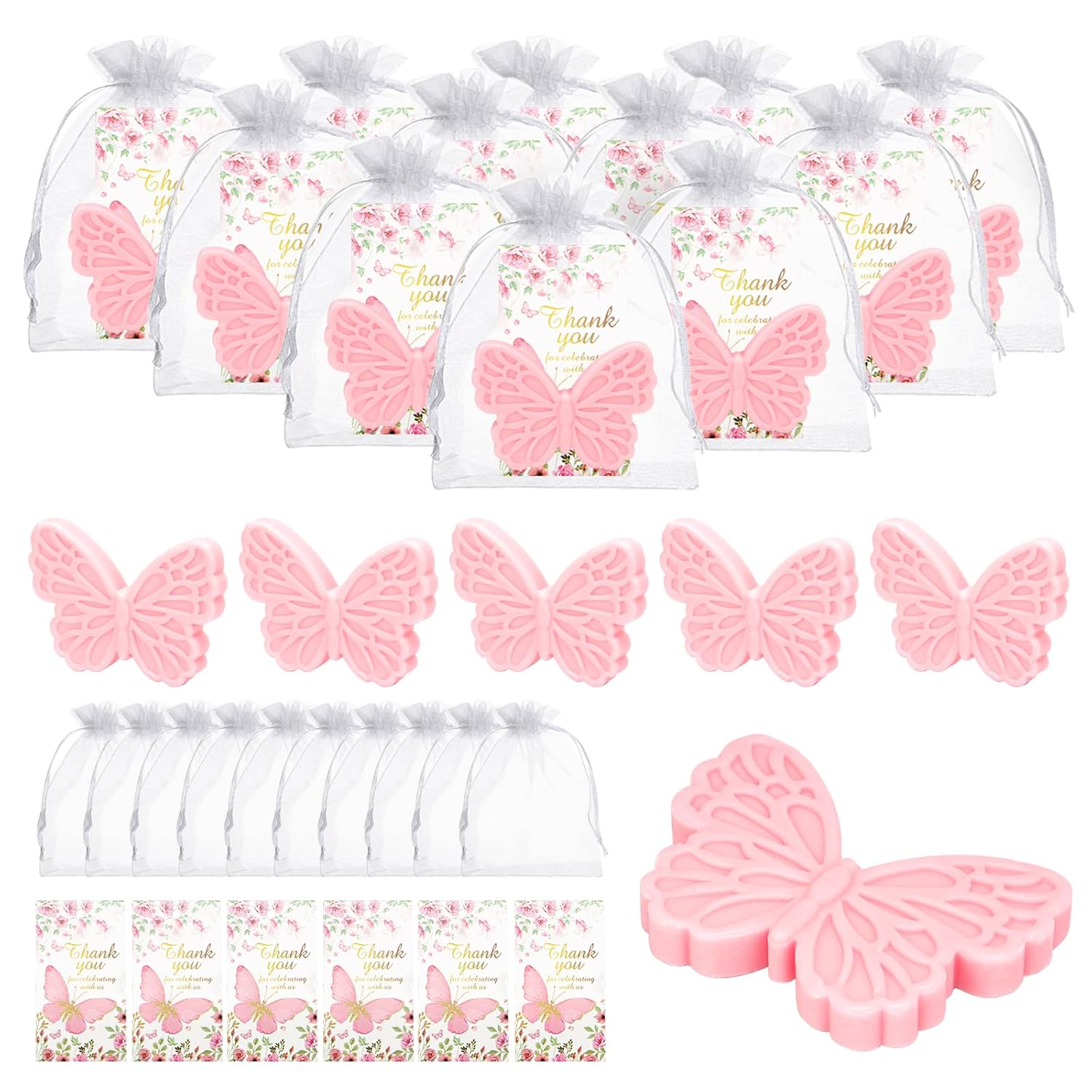 50Sets Butterfly Baby Shower Favors for Guests Butterfly Soap Favors Handmade Scented Soap with Thank You Cards Organza Bags for Gender Reveal Baptism Decorations Wedding Bridal Return Gift(50, Pink)