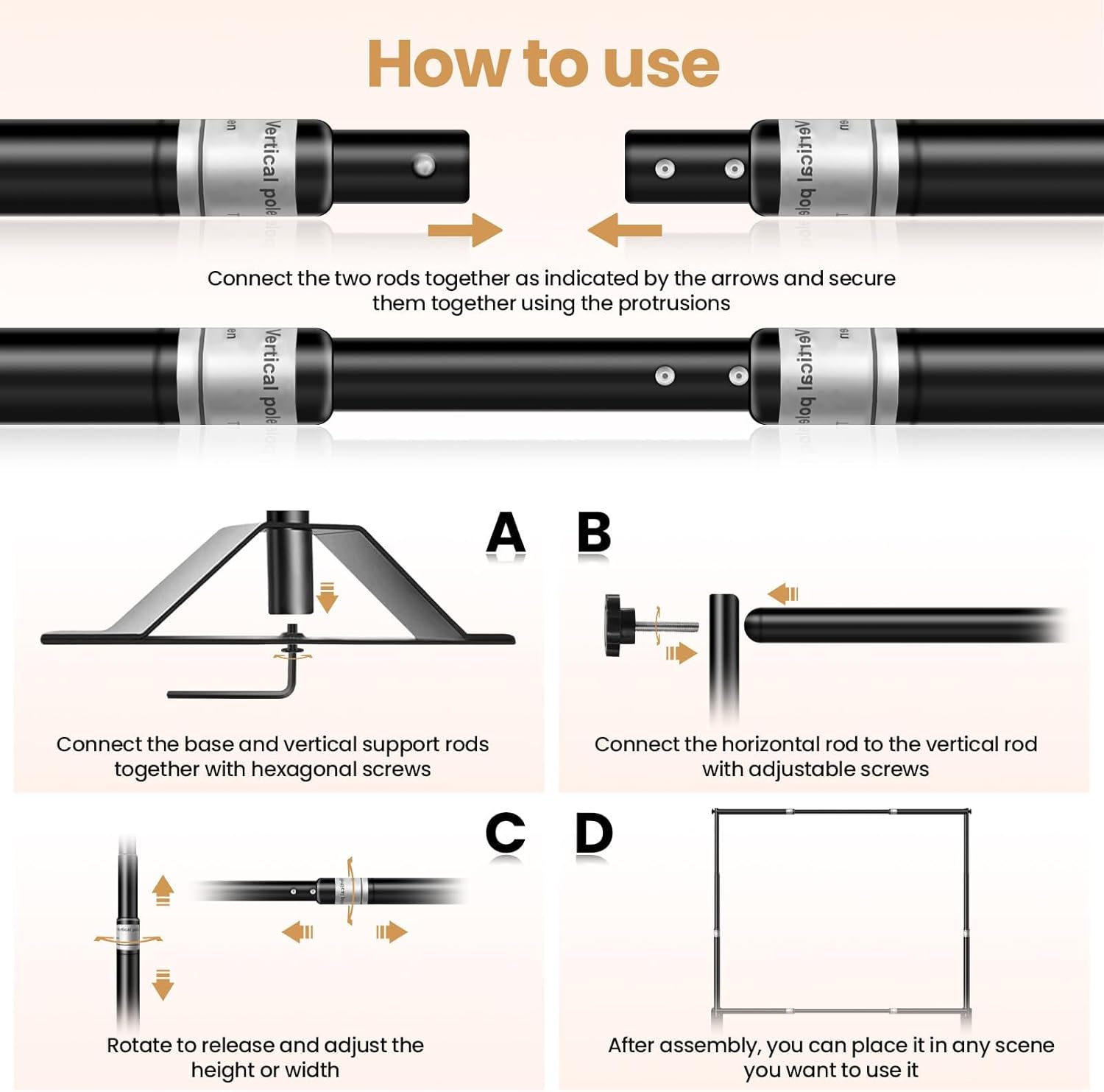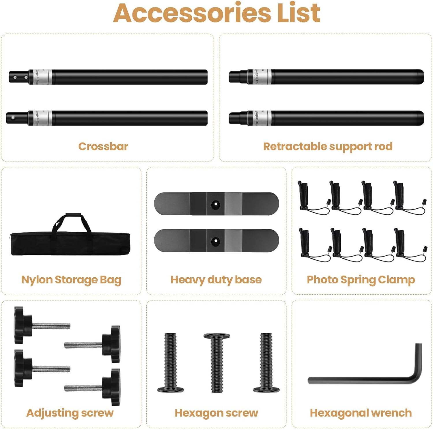 • 【Wide Application】The heavy duty backdrop stand is perfectly suitable for trade show, parties, conferences, promotion banner, weddings, birthday, baby shower, exhibitions, business events and so on. Photography backdrop stand can hang drapes, balloons to make your backdrop amazing, the carrying bag is convenient to store and transport it anywhere with you.