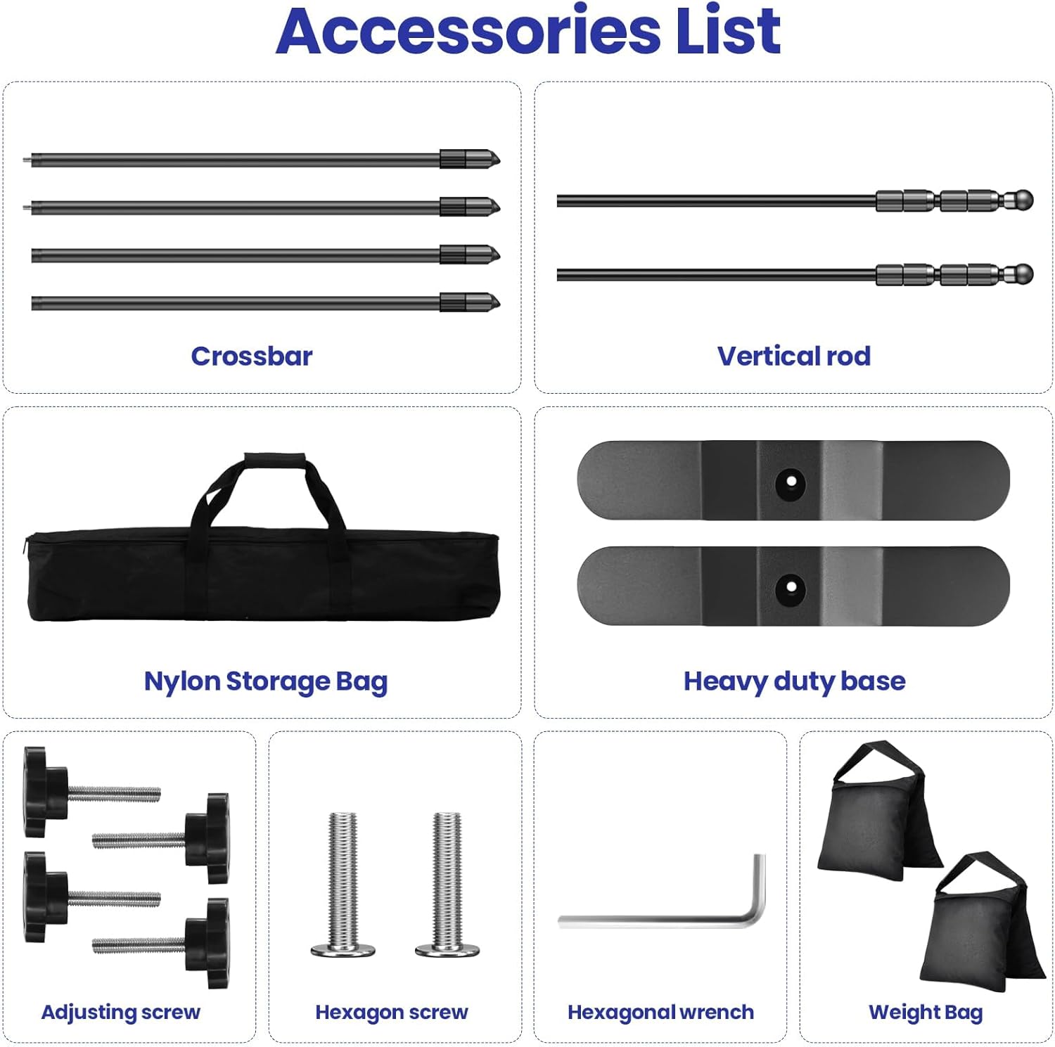 • 【Package includes】: (2) x Heavy Duty Base, (2) x 8ft Adjustable Vertical Tube, (4) x 5ft Adjustable Horizontal Tube, (2) x Screws, (1) x Hex Key Wrench, (2) x Sandbag, (1) x Carry Bag.
