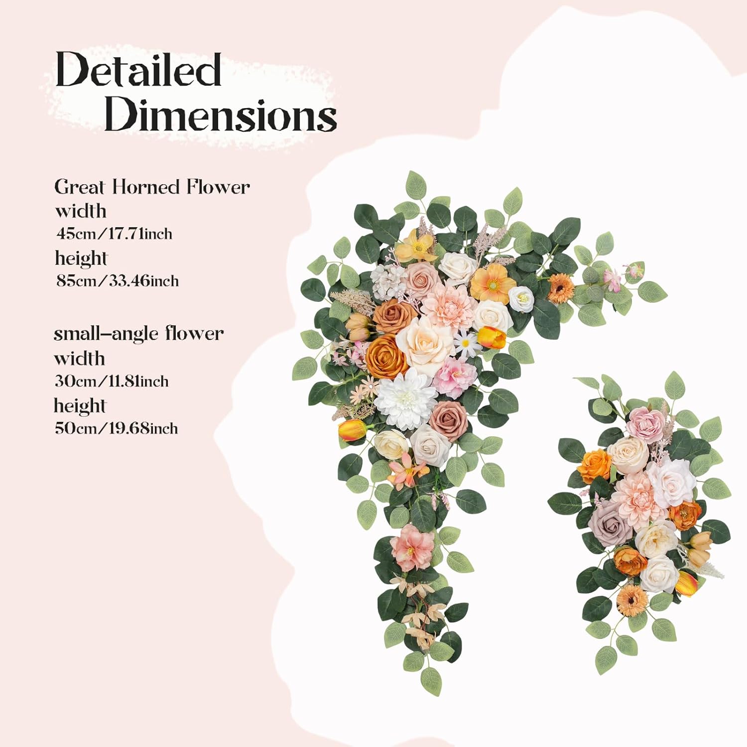 • ๐ŸŒท Size and Package๏ผšOur wedding arch flowers has a large corner size of 33.46 "L x 17.7" W and a small corner size of 19.68 "L x 11.8" W. The wedding decor packaging contains a total of 3 kinds of accessories,including Wedding Flowers Ornament x2 + Cable Tie x 6 +20pcs plastic stems (Does not include wooden sign and bracket).