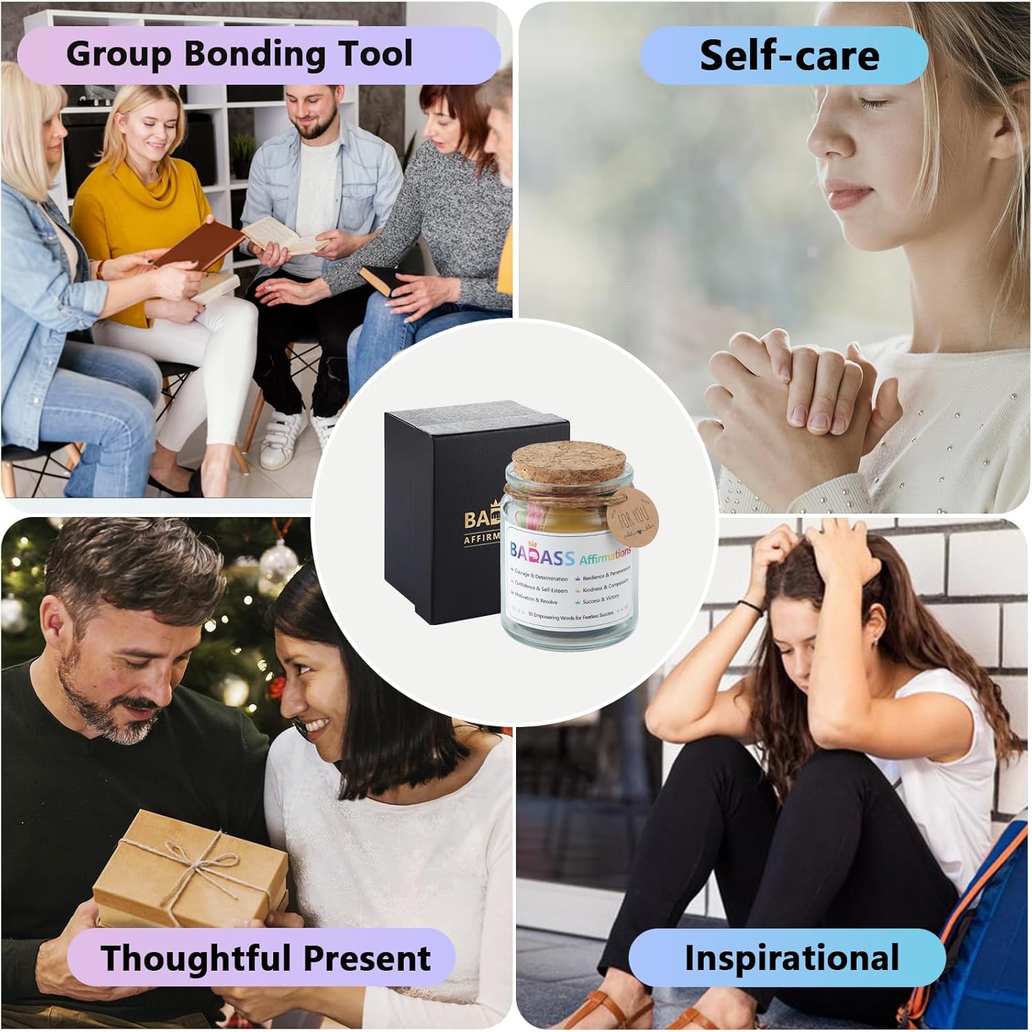 • Badass Built to Last: The high-quality glass and the well-fitting lid ensure its durability. The printed sentences are designed to withstand handling and time. Cards feature smudge-proof laminationβ€”unbreakable by weights, lipstick, or coffee spills! A tank guarding your rebellion. Prime hostess gift/party gift that screams "SHE GETS IT"–guaranteed crowd-pleaser fun gift.