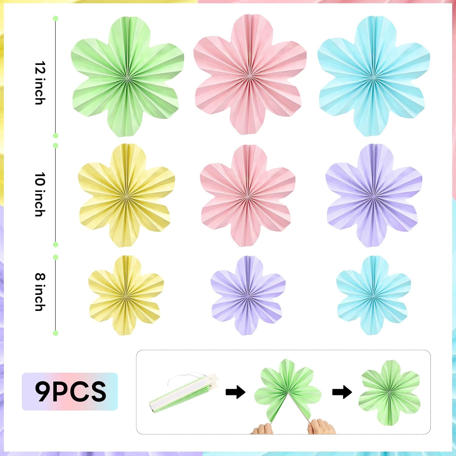 • Pastel Party Decorations: Our pastel paper fans decorations kit includes 3 pcs 12’’ paper flowers, 3 pcs 10’’ paper flowers, 3 pcs 8’’ paper flowers, 10 pcs hanging swirls, 1 pcs 6.56ft tasseled garland, 1 pcs 6.56ft triangular pennants, 2 pcs circle dot garland, 2 pcs ribbon.