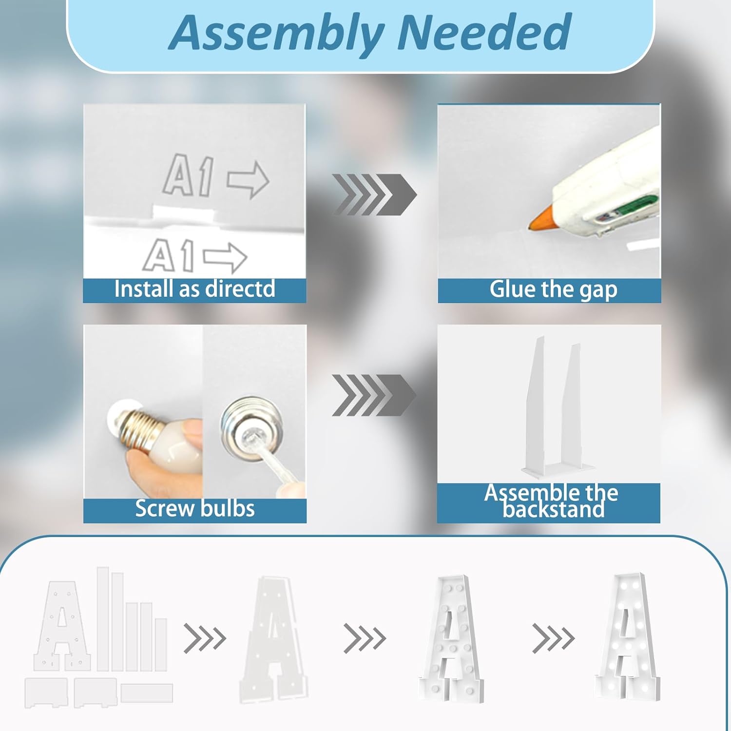 • 【Assembly Required】Each marquee number is made of precisely pre-cut foam board, comes with the same model of light string and LED bulb, and a user-friendly instruction manual. According to our installation manual, ① Fold the side panels along the cutting line and stick them to the bottom panel with hot melt glue according to the corresponding number. ② Screw the bulb onto the single board, and then install the LED light string into the bulb. (Note: Glue gun and battery not included)