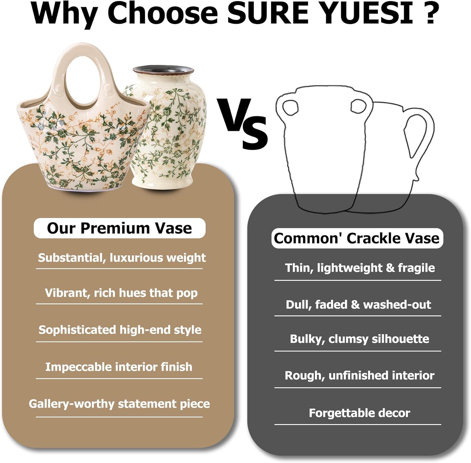 • Elegant Vintage Design: The SURE YUESI vintage vase is a handcrafted green and beige vase with a timeless round silhouette. Its beautiful design adds a touch of chinoiserie decor and vintage home decor charm, making it an eye-catching accent for any room.