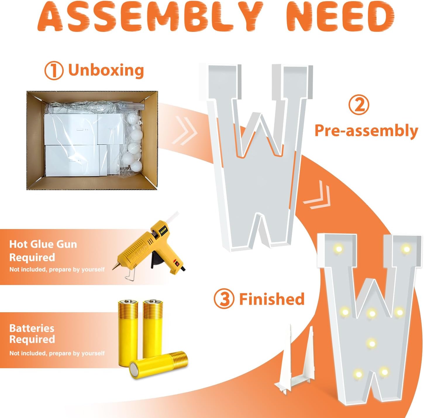 • BRIGHT & SAFE LIGHTING: The light up letters are powered by 3 AA batteries(not included), ensuring the safety of all your guests. There's a switch on the battery compartment, you can switch the Warm Yellow led light from steady to cheerful flashing, ideal for creating a cozy, inviting ambiance to any celebration or event.