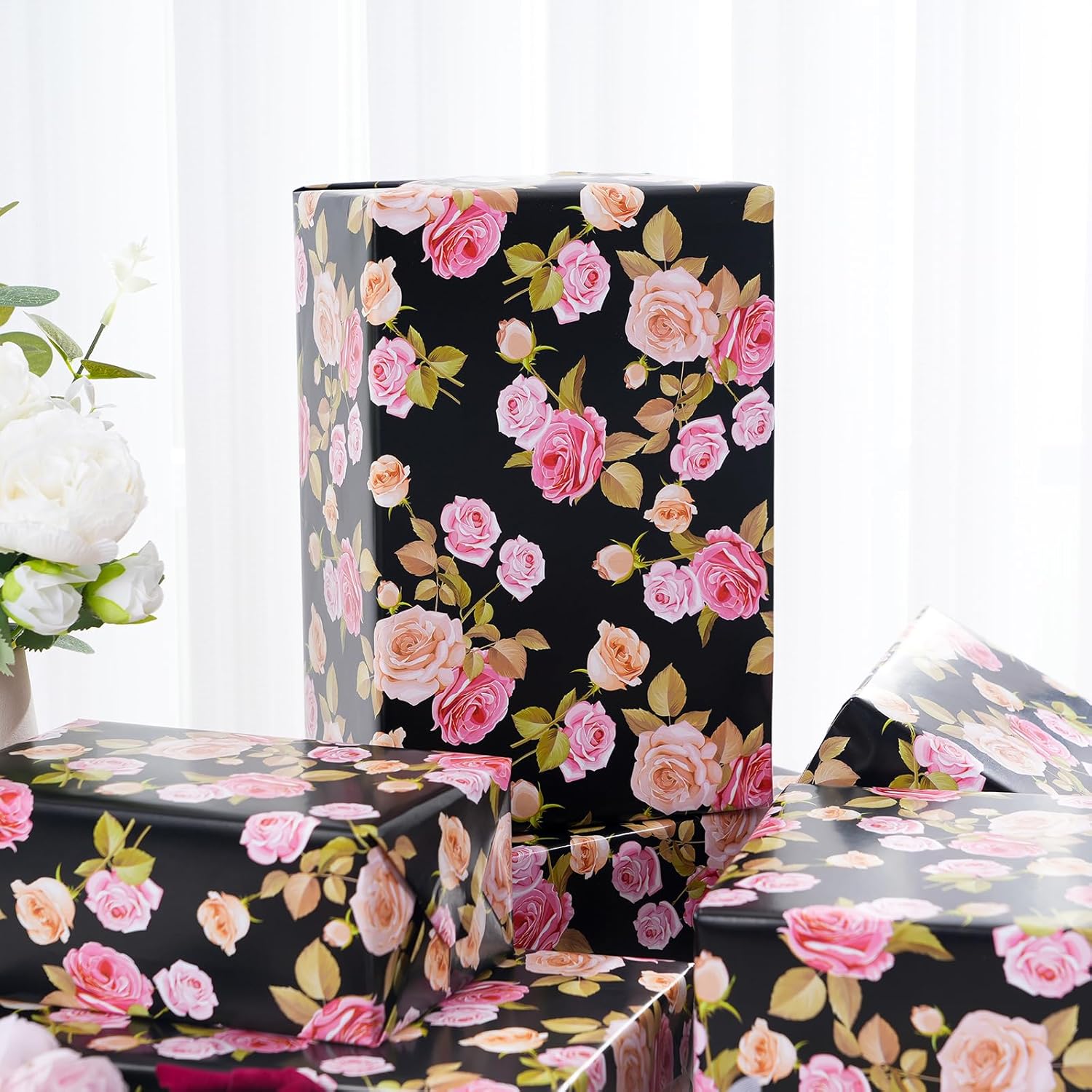 • ELEGANT DESIGN: An array of beautifully illustrated roses in soft pink and cream hues set against a rich black background. Classic and modern wrapping paper is sure to make your gift stand out with elegance and romantic.