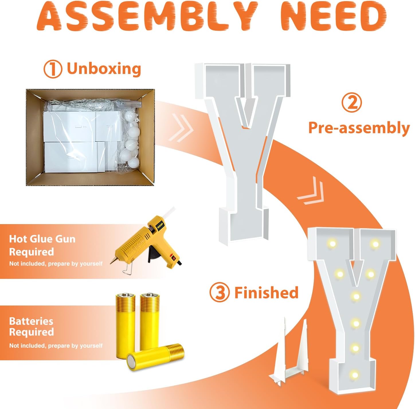 • BRIGHT & SAFE LIGHTING: The light up letters are powered by 3 AA batteries(not included), ensuring the safety of all your guests. There's a switch on the battery compartment, you can switch the Warm Yellow led light from steady to cheerful flashing, ideal for creating a cozy, inviting ambiance to any celebration or event.