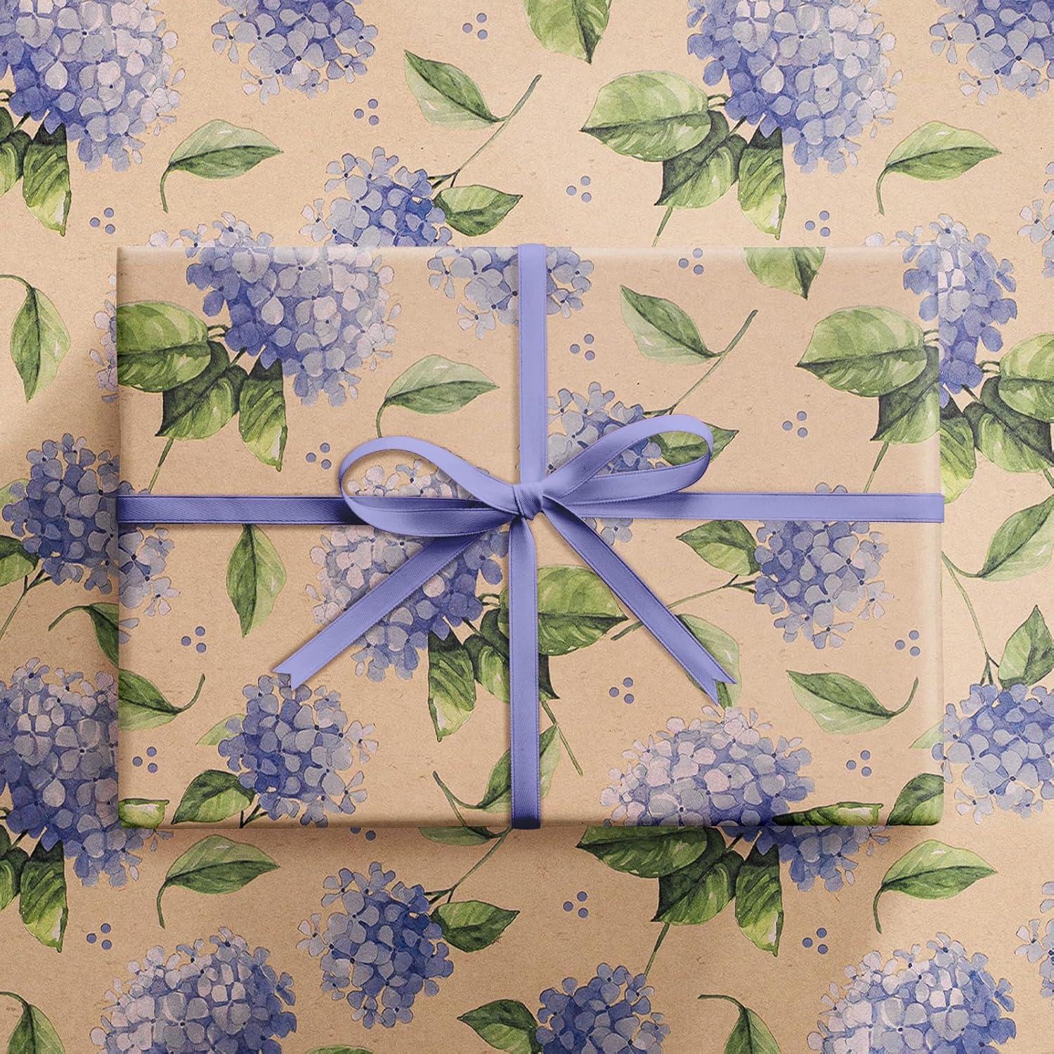 • Elegant Wrapping Paper: Features purple hydrangea flowers with delicate blooms, paired with vibrant green leaves against a warm kraft paper background. Perfect for adding a refined touch to any gift, it brings the beauty of blooming flowers and natural elements into your wrapping