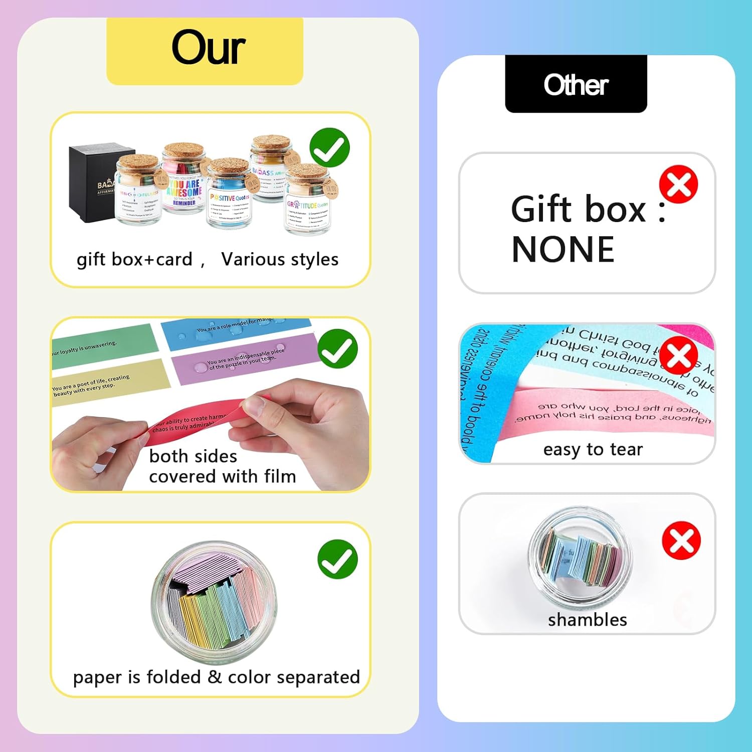 • Anytime, Anywhere, Convenient Gratitude: Whether it's the living room, bedroom, or study at home, or the picnic spot outdoors, during a trip, this glass jar can come in handy at any time. Start a gratitude ceremony in the morning, draw strength during a work break, make a gift on a leisurely afternoon, and record beauty at night, making gratitude integrate into every moment of life