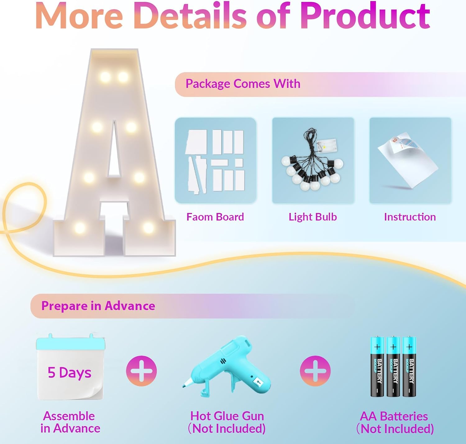 • Crafted from Sturdy Foam Board: Built with Sturdy foam board, our 3ft marquee light up letters provide exceptional stability and long-lasting performance. The included backstand ensures they stay firmly in place, offering worry-free party decorations