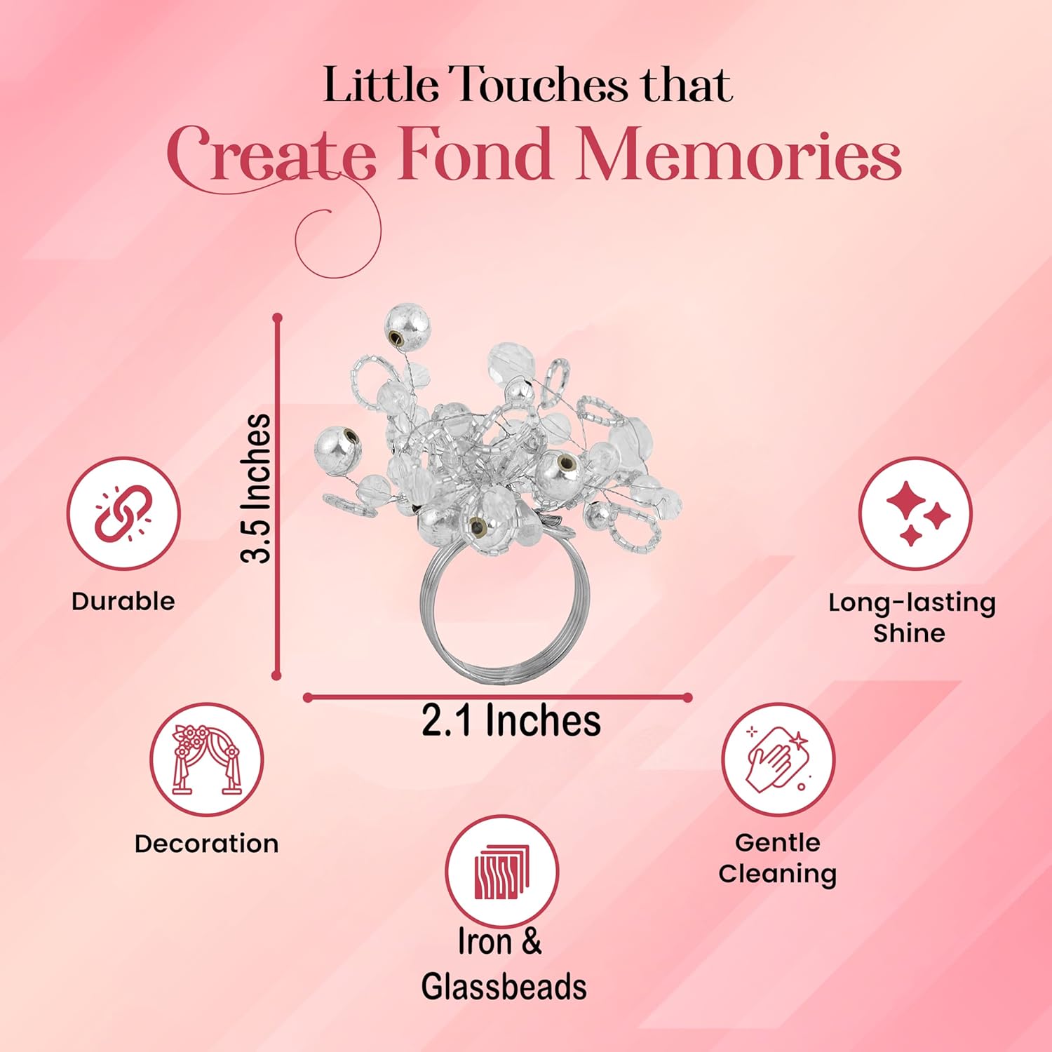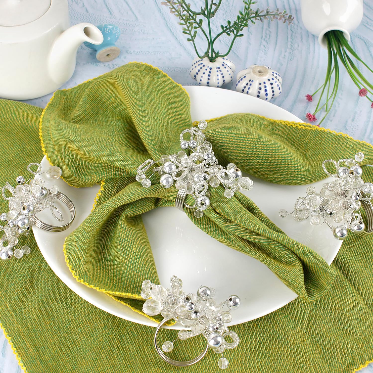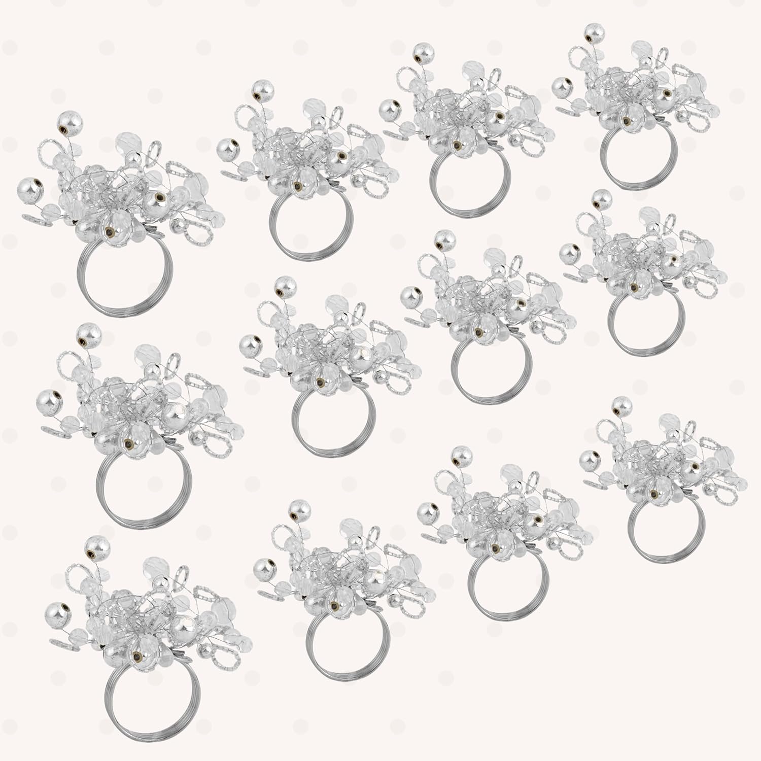 Decorative Napkin Ring Set of 12 - Handmade Glass Beads Napkin Holders for Table Setting Elegant Dining Accessory Round Heavy Duty Metal Frame Wedding & Party Table Décor (Silver) - CLEENTABLE