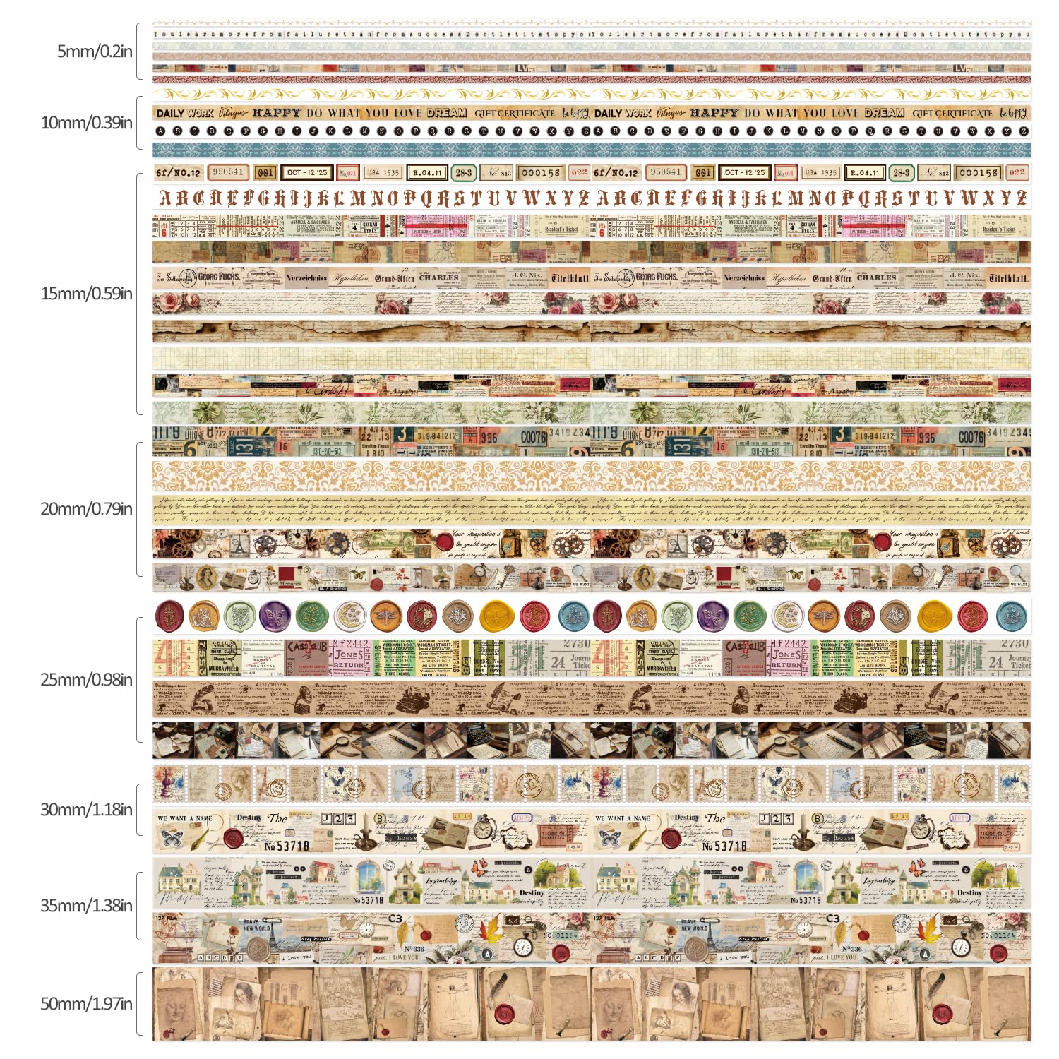 34 Rolls Vintage Washi Tape Set,Letter Map Stamp Stripe Literature Art Writable Aesthetic Washy Decorative Tapes for Scrapbooking, Junk Journal Supplies, Bullet Journaling 5-50mm Wide (3m Long)/Roll