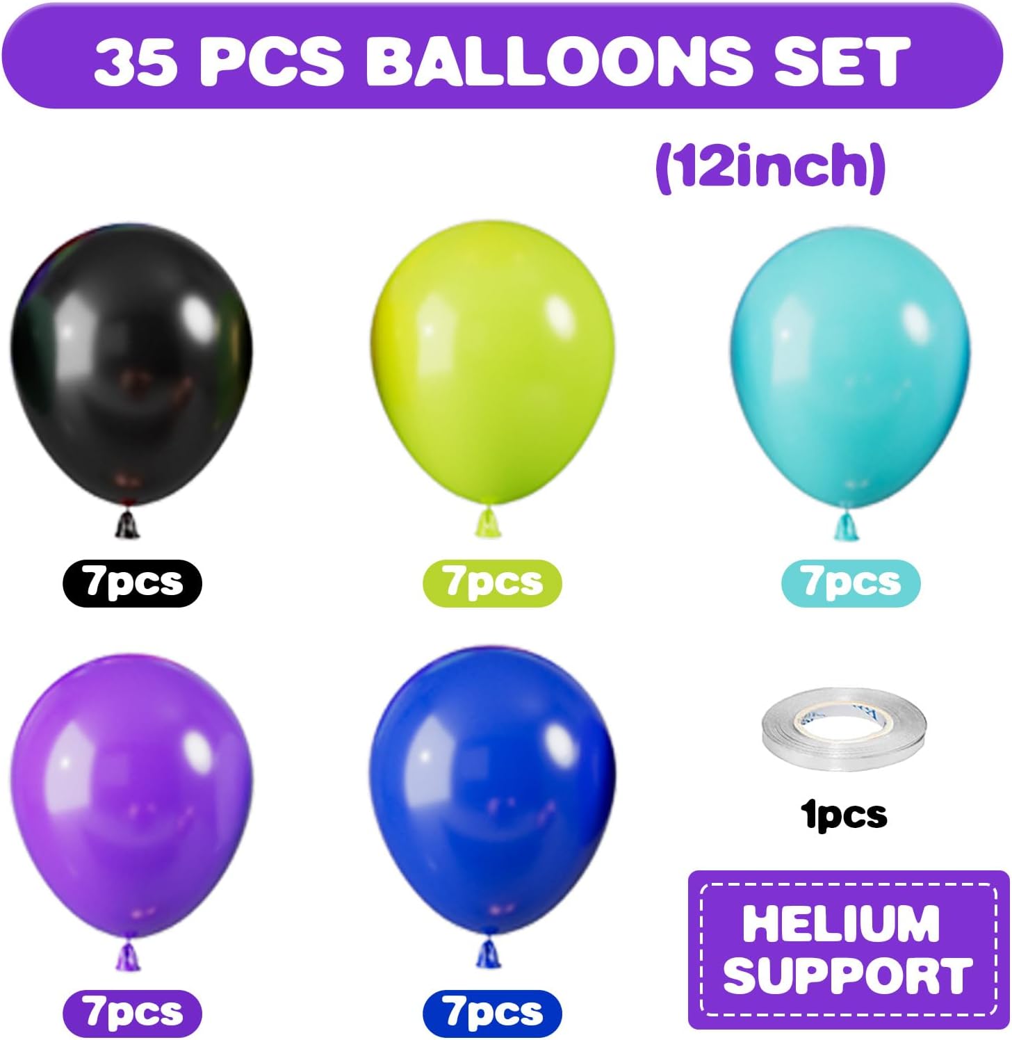 • 35 Pcs Green Blue Black Balloons: Add a pop of charm to your party with this vibrant set of 35 pcs balloons, including 7* fruit green balloons, 7* royal blue balloons, 7* black balloons, 7* purple balloons, 7* teal blue balloons and 1* white ribbons. These purple green balck balloons will make your party venue look stunning and create the wonderful backdrop for unforgettable moments.