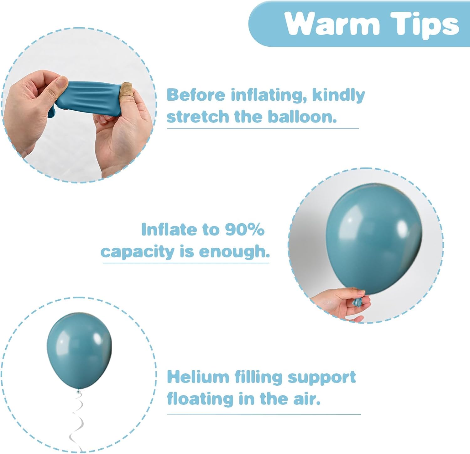 • Friendly Reminders: After inflating, you may notice the balloon colors appear lighter, and lighting can also affect their appearance. To keep them looking their best, avoid sharp objects, rough surfaces, and direct sunlight. Store any unused balloons in a cool, dry place to maintain their quality. If you have any questions, please feel free to reach out!