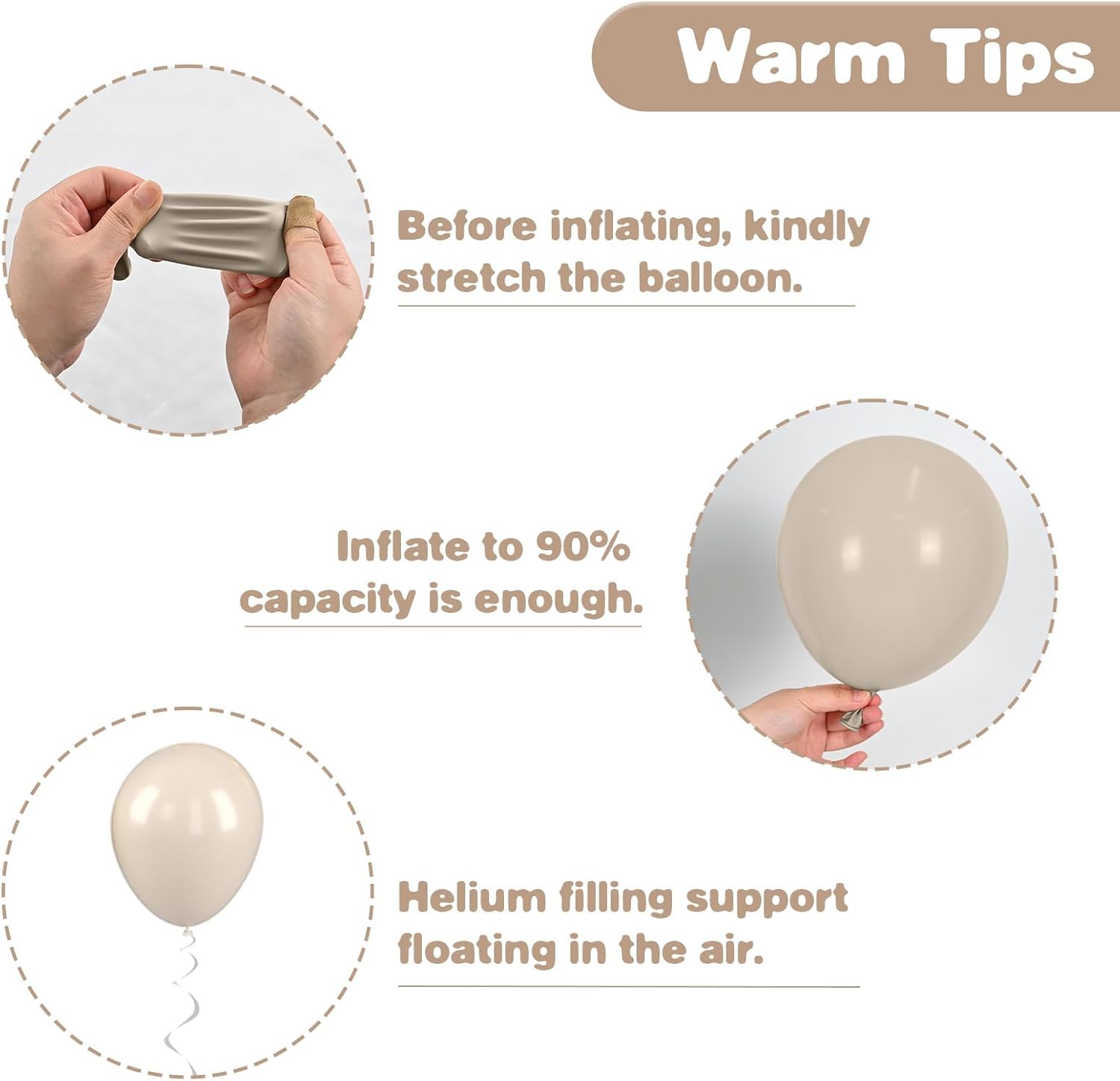 • Friendly Reminders: After inflating, you may notice the balloon colors appear lighter, and lighting can also affect their appearance. To keep them looking their best, avoid sharp objects, rough surfaces, and direct sunlight. Store any unused balloons in a cool, dry place to maintain their quality. If you have any questions, please feel free to reach out!