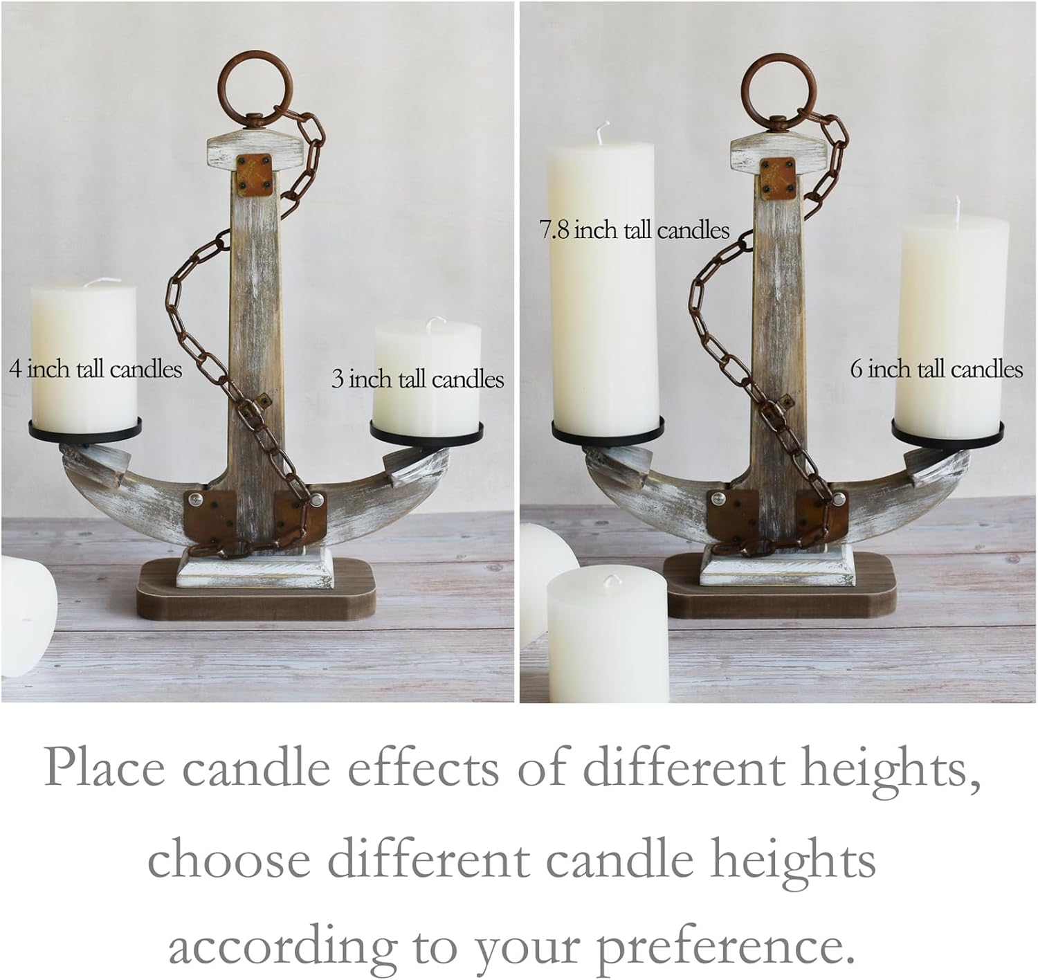 • Candle Stand Size: Overall size: 12.6"Lx 3.54"Dx15.35"H. The wooden anchor candle holder perfectly balances the natural and industrial styles, adding a warm retro atmosphere. The iron cup diameter of the candle holder: 3", load-bearing: 2.2 pounds, it is suitable for most types of candles, making your home more beautiful and elegant. (Candles are not included)