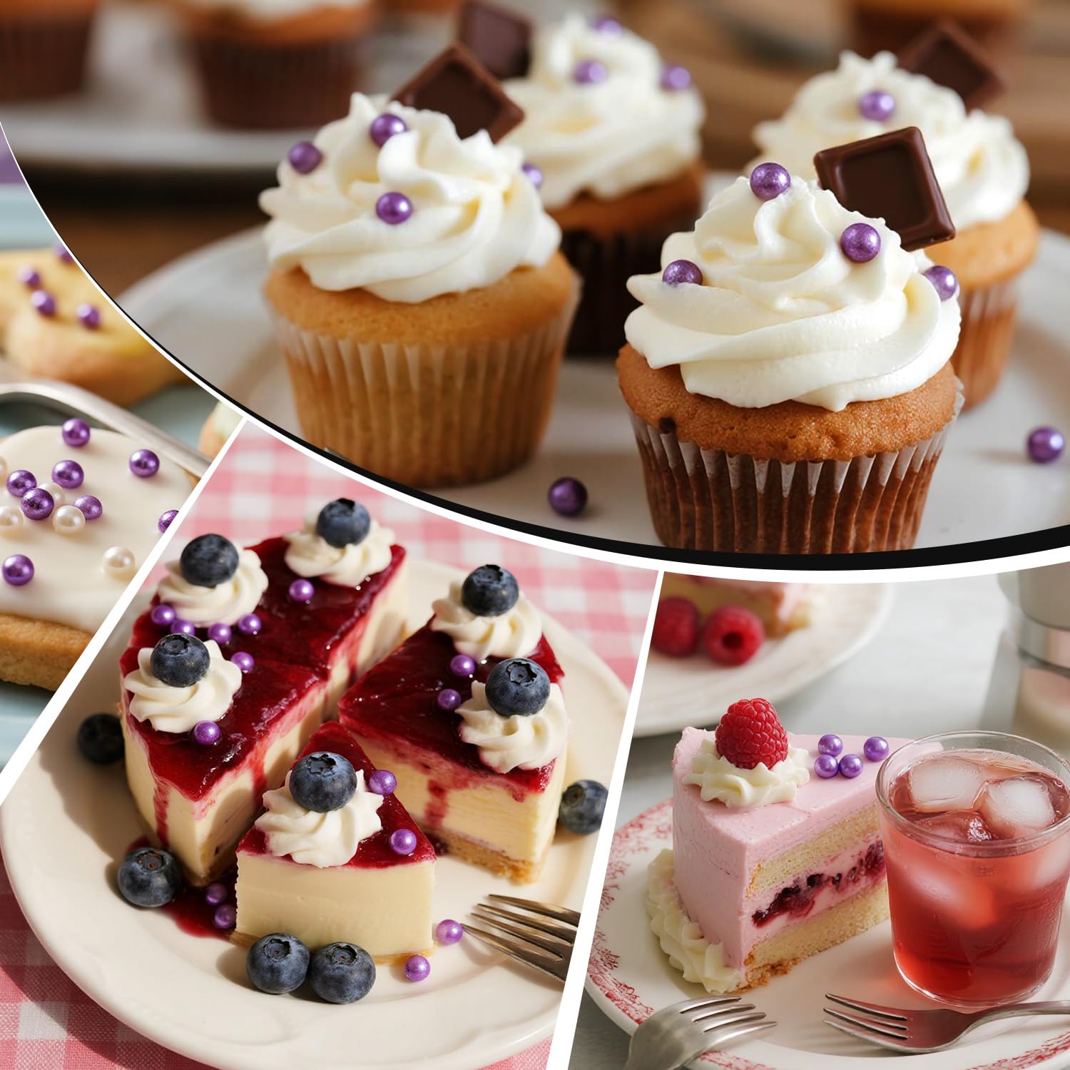 • The Edible Purple Pearl Sprinkles feature a unique mixed-size design. They are perfect for birthday cakes, cupcake toppers, cookies, ice creams, waffles, and any dessert. These sprinkles will make your baked goods prettier.
