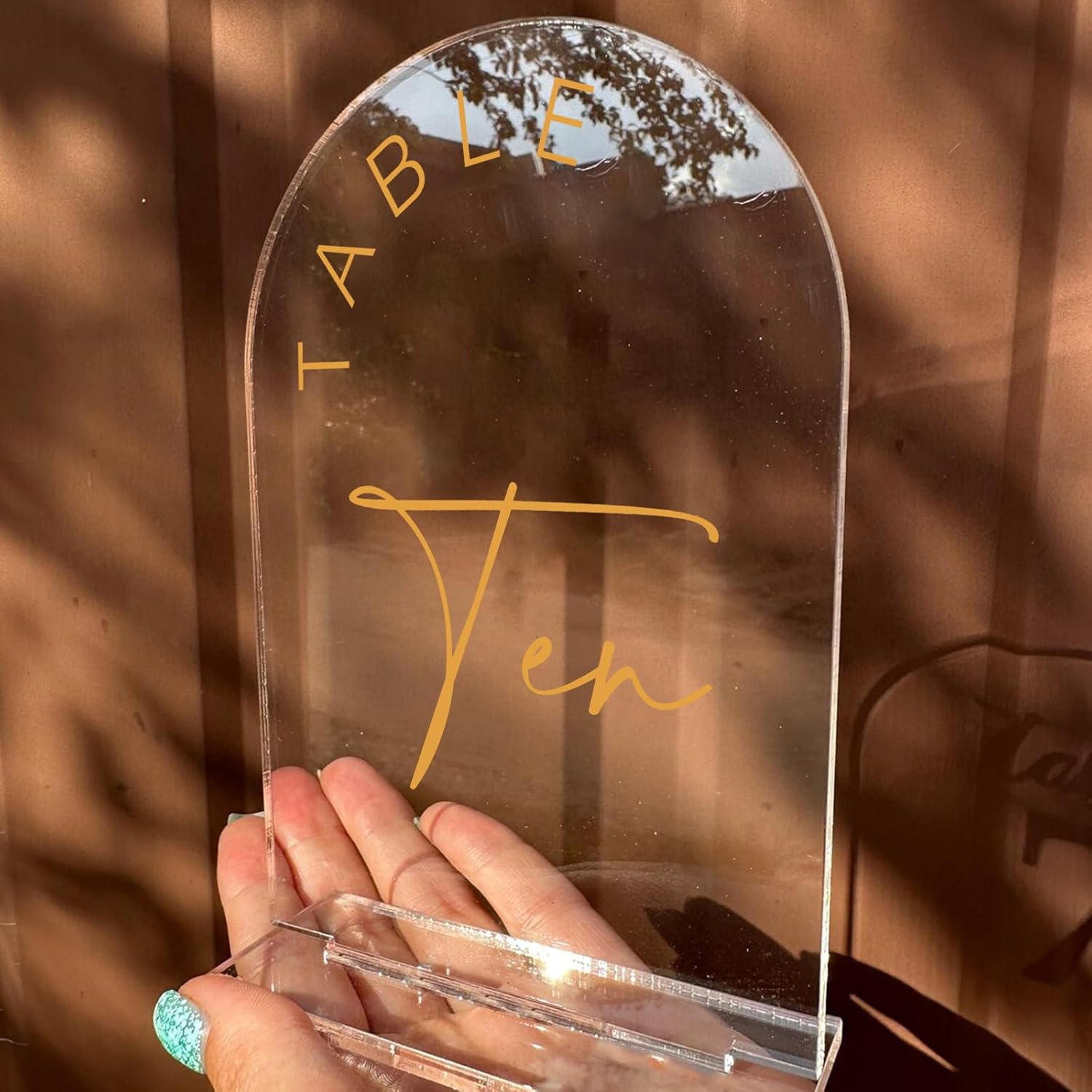 • PREMIUM QUALITY: These clear arch table numbers with stands are made from high quality clear acrylic and then printed with gold letters in a simple arch design that won't go out of style and will last a long time.
