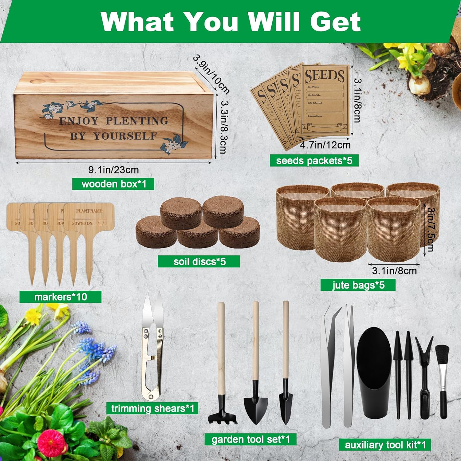 • 𝐀𝐞𝐬𝐭𝐡𝐞𝐭𝐢𝐜 & 𝐅𝐮𝐧𝐜𝐭𝐢𝐨𝐧𝐚𝐥 𝐃𝐞𝐬𝐢𝐠𝐧: The wooden box of our plant starter kit features a unique pattern with a slide-on lid for easy access and dust prevention. The double-layer burlap is breathable and durable, providing an ideal environment for plant roots. Every detail is thoughtfully designed.