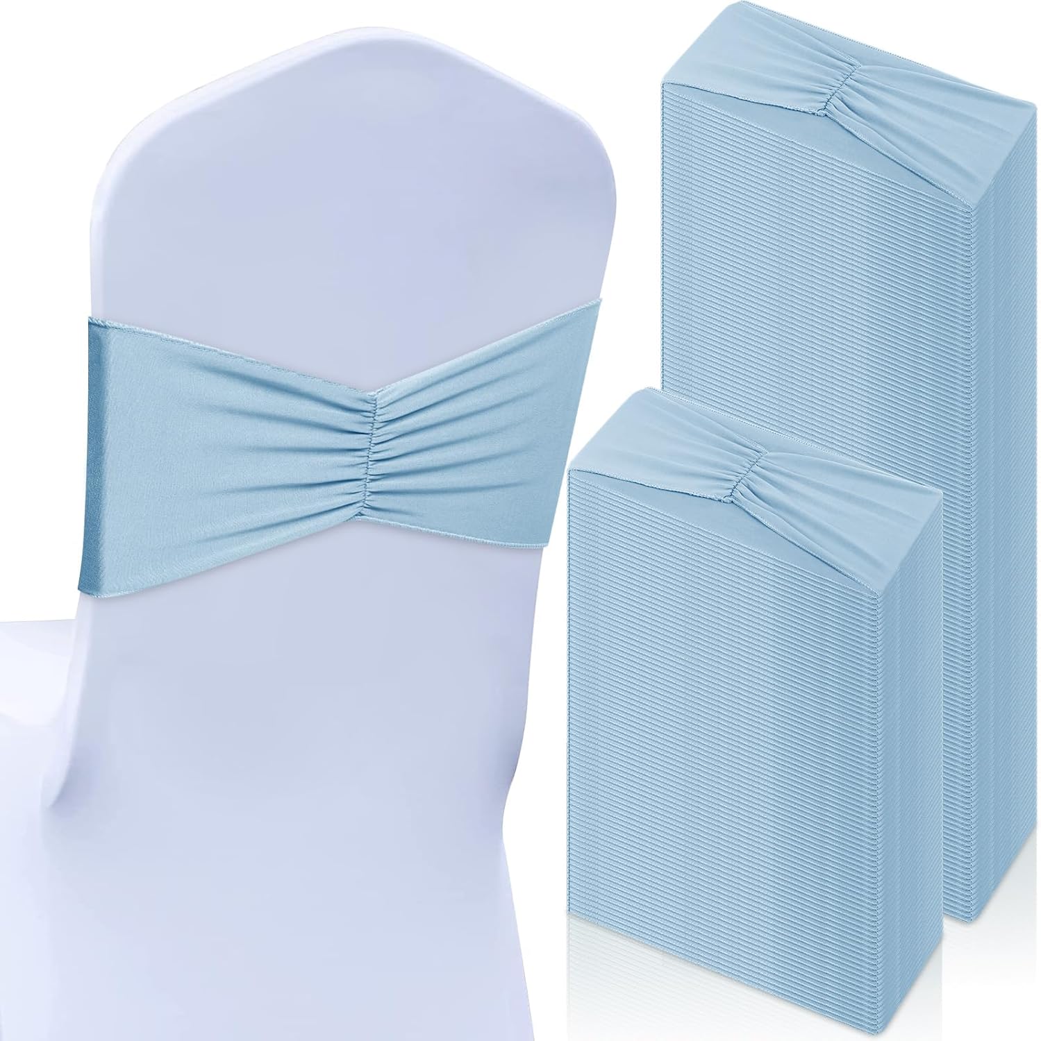 Moukeren 100 Pcs Spandex Chair Sashes Bows Bands Slider Sashes for Chair Covers Elastic Bands Ties Ribbon Decorations for Wedding Party Events Ceremony Birthday Banquet(Sky Blue)