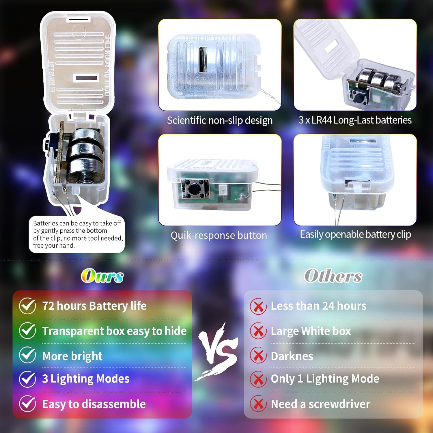 • IP65 WATERPROOF AND INDIVIDUALLY WRAP: The battery fairy lights are waterproof can be used for Indoor/Outdoor. (the battery pack is not waterproof) safe to the touch. Made of soft bendable wire so you can easily bend into any shape or wrapped it on anything such as Christmas trees, wine bottle, pumpkins, guirlande lumineuse interieure, potted landscape etc.Each light is individually packaged, say goodbye to cable tangles and bring more happiness and satisfaction to your family and friends