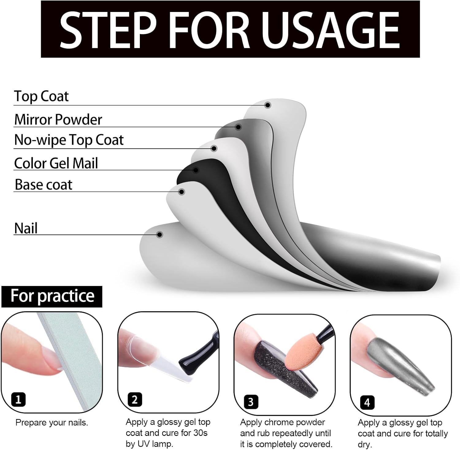 • The Scope Of Application:All chrome powders should only be applied to glossy No wipe top coat to embellish Nail-Polishes color. Otherwise it is unusable, it can't be applied directly to the nail, and it can't be applied directly to the skin. Artdone chrome powder can be applied on UV gel nails, acrylic nails or false nail tips. You can use them very easily