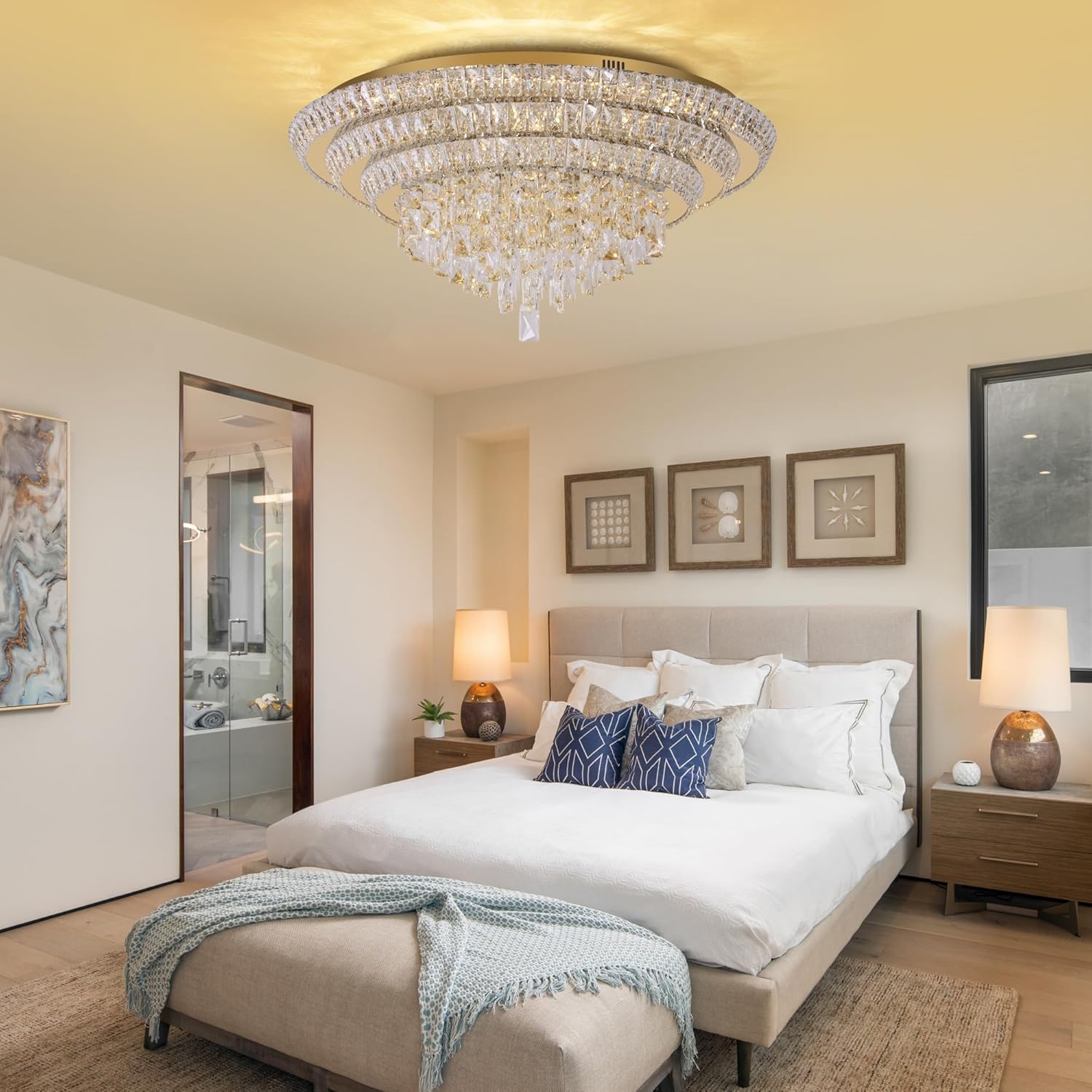 • Crystal flush mount gold ceiling light: made of K9 crystal and stainless steel; 3 modes lights Warm/natural/white is adjustable with wall switch; Coming remote is easy to control for all functions and temp or brightness's control.