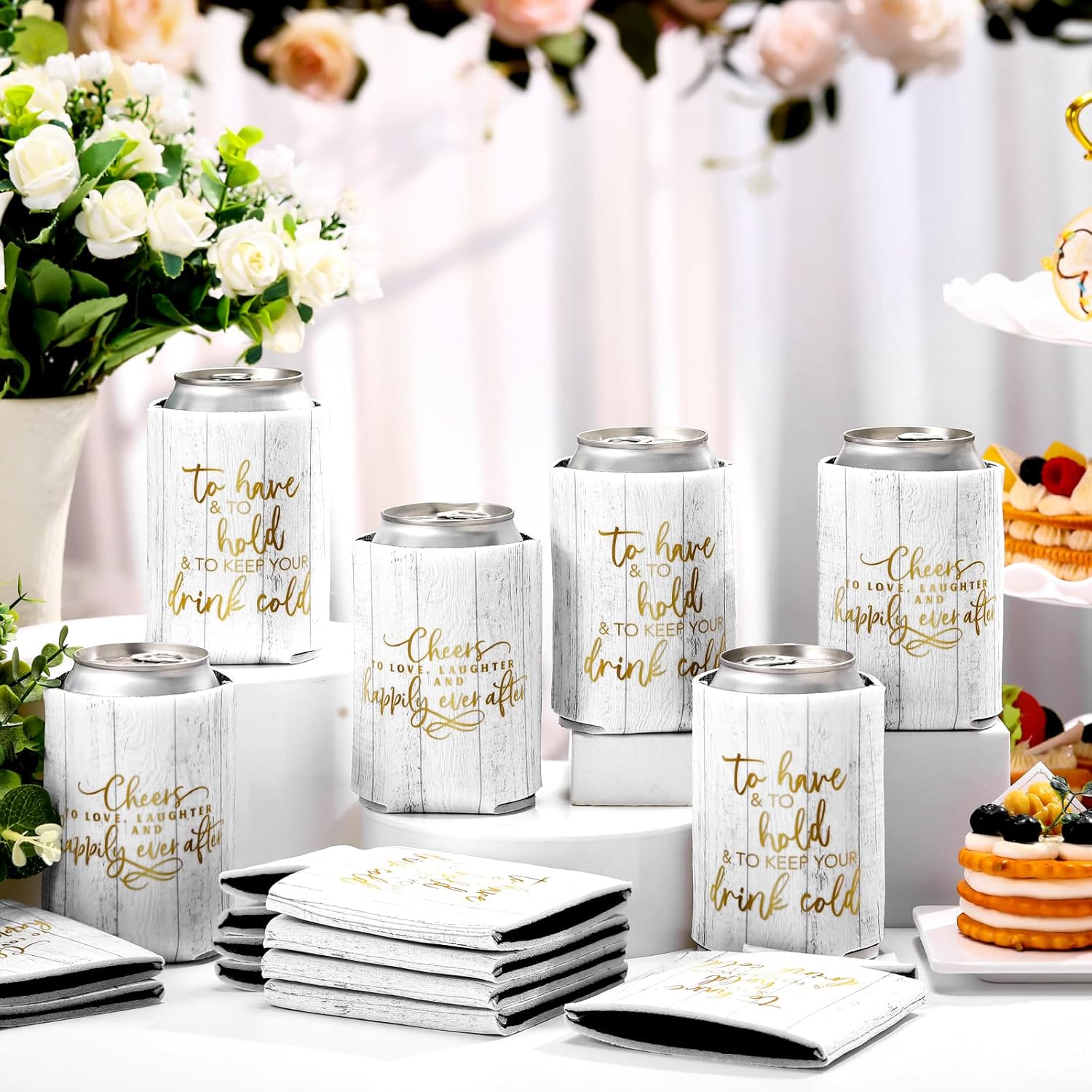 • Satisfying Party Package: our huge package containing 50 pieces of wedding can cooler decorations; Make every drink a celebration with our rustic wood and gold can coolers; They are suited to uplift the atmosphere at weddings, bridal showers, and bachelorette parties