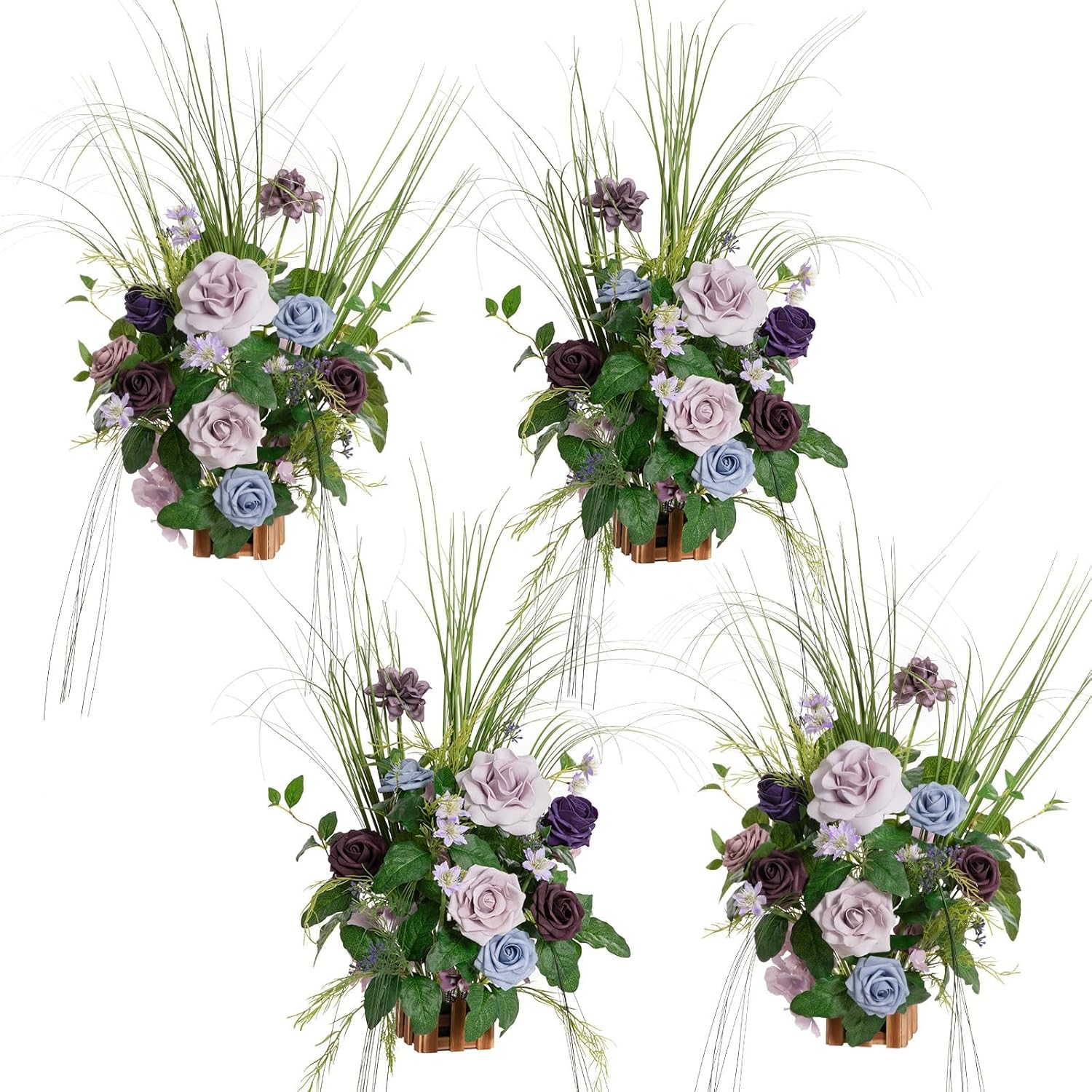 Ling's moment 17.5" Tall Standing Artificial Flowers Arrangements 4 pcs Wedding Aisle Runner Chair Decorations Provence Blue & Purple Centerpieces for Ceremony Reception Rose Floral Party Outdoor