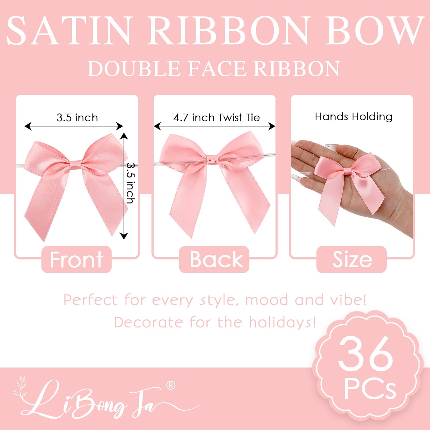 3.5" Pink Bow Satin Pre-Tied Bows for Gift Wrapping, Small Bows for Crafts, Premade Bows, Candy Apple Bows, Twist Tie Bows for Cake Decorating, Party Favor, Wedding Decoration-36 Counts