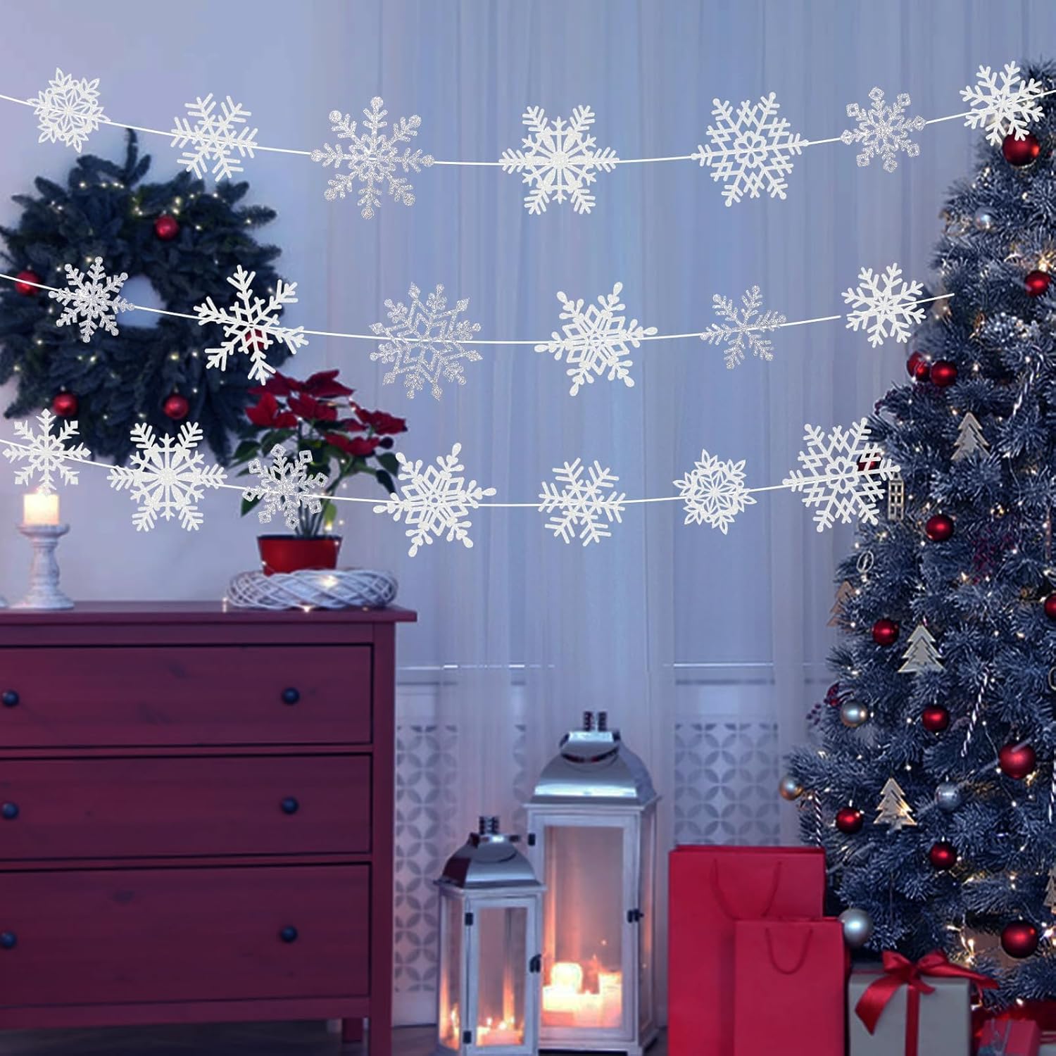 • Durable and Strong Construction โ€“ Each xmas hanging snowflake is made from multi-layered, sturdy paper treated with glitter, ensuring they remain intact and donโ€™t lose their shape. The layered design ensures durability, making them suitable for repeated use during festive seasons