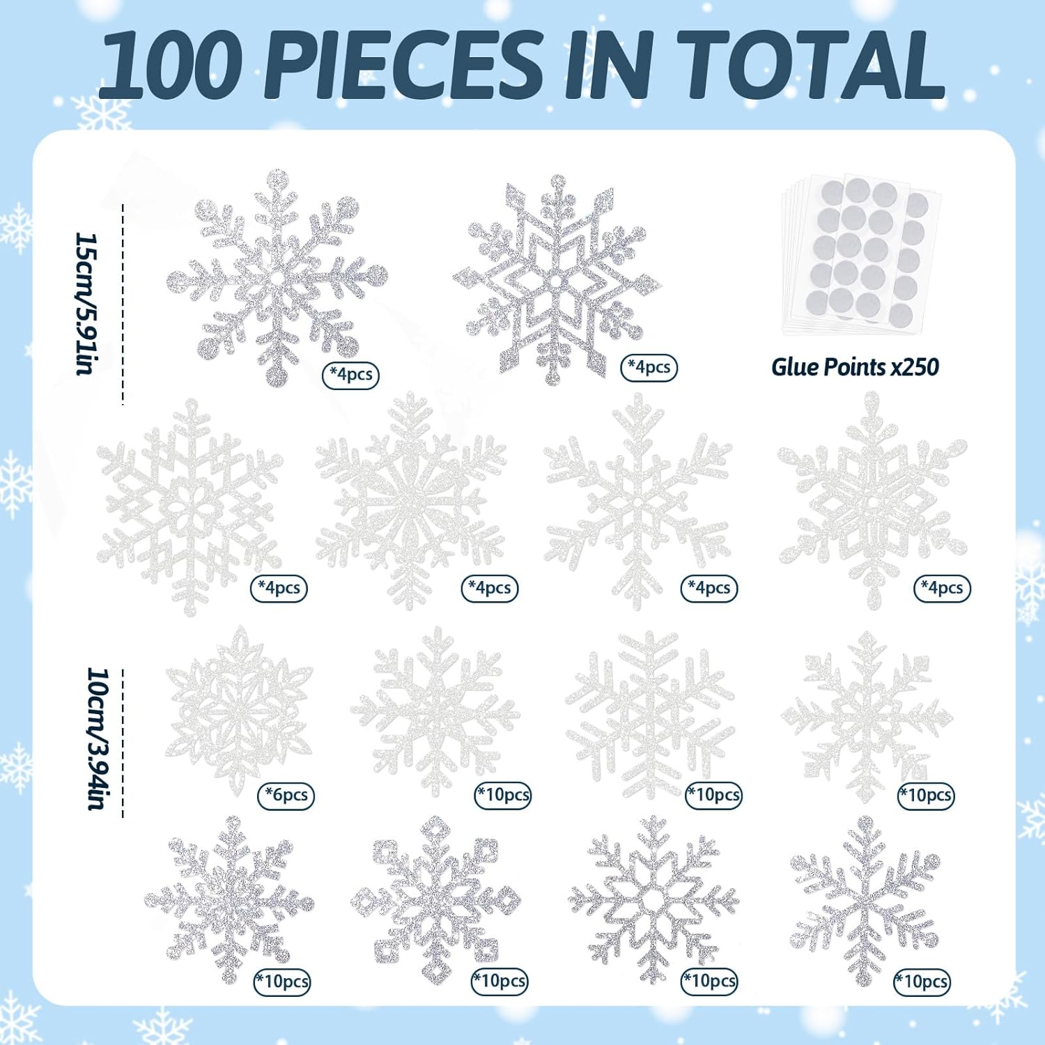 • Elegant Winter-Themed Design โ€“ This snowflake decorations set includes a total of 100 intricately designed glitter snowflakes in white and silver with sizes of 10cm and 15cm. The set also includes 250 glue points for easy application, making it ideal for transforming your home into a magical winter wonderland