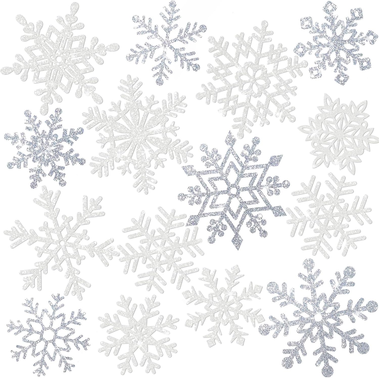 • Variety of Beautiful Snowflake Shapes โ€“ With 8 unique snowflake cutouts for the white snowflakes and 6 different designs for the silver ones, this set offers the perfect mix of intricate, glittering patterns. The snowflake glitter adds an extra sparkle, creating a stunning effect in any space